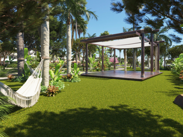 Serenity boasts ample green and landscaped areas, with each phase of the development blending harmoniously with the surroundings. In the central area, there is a pool with a beach-type entrance, jacuzzis, a crazy golf course, and a yoga practice area.
