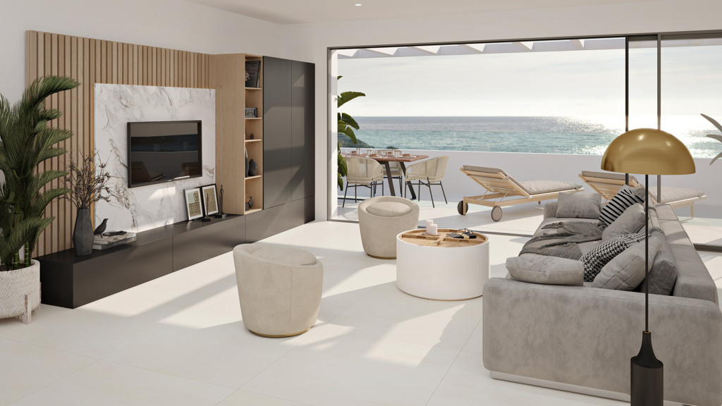 First of all, it starts with a unique architecture with well thought out layouts, large outdoor spaces and always partial sunshine for everyone’s terrace, after all, you are buying an apartment on the Costa Del Sol. The apartments are south, south-west orientated and look out over a park-like garden with swimming pools, over the green landscape towards the coasts and they almost all have sea views as well. Then of course the selection of an excellent contractor, specialised in building in the top end of Andalusia and using A-brands for all materials and finishes.