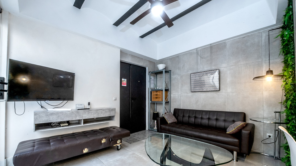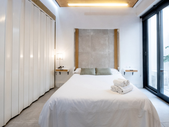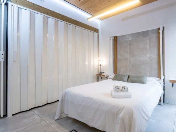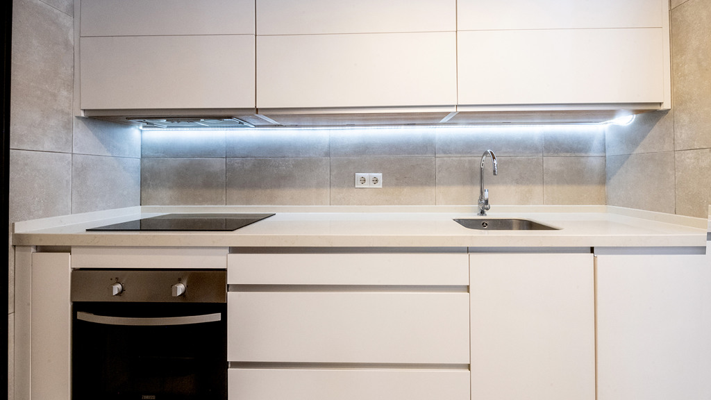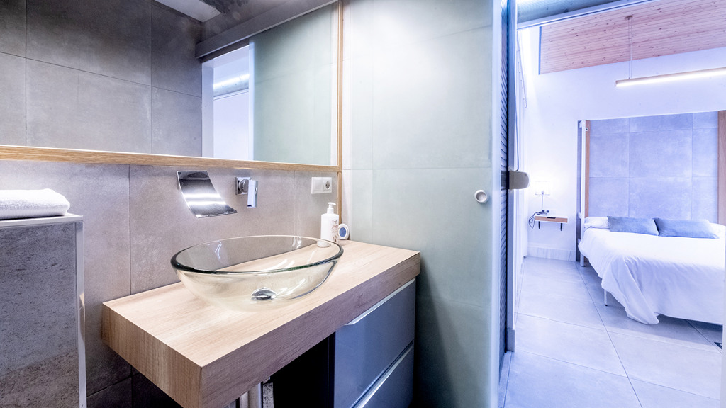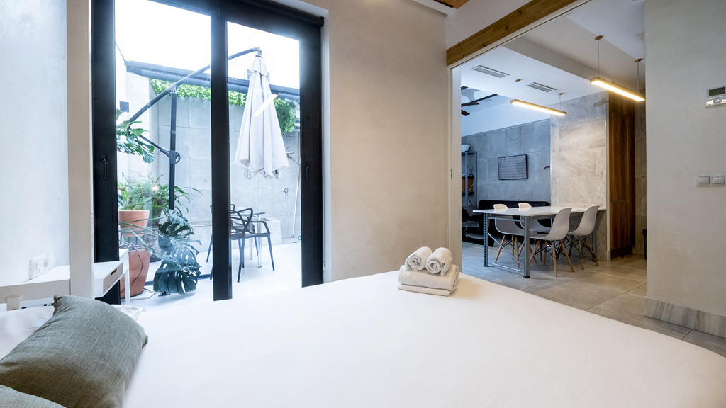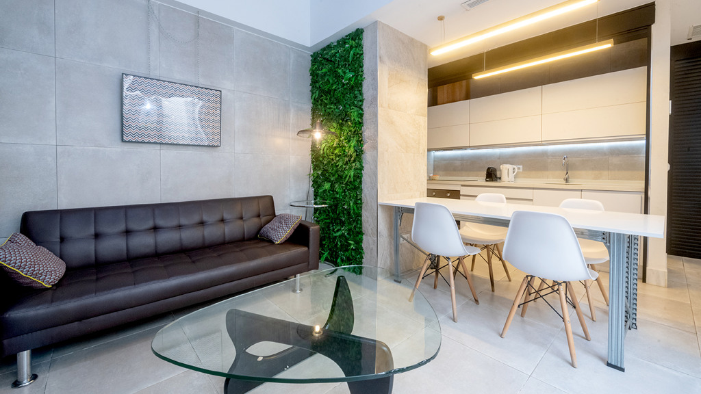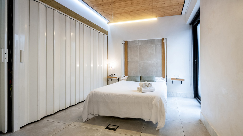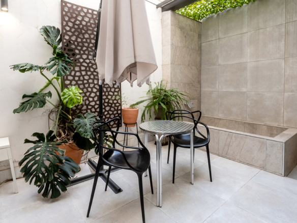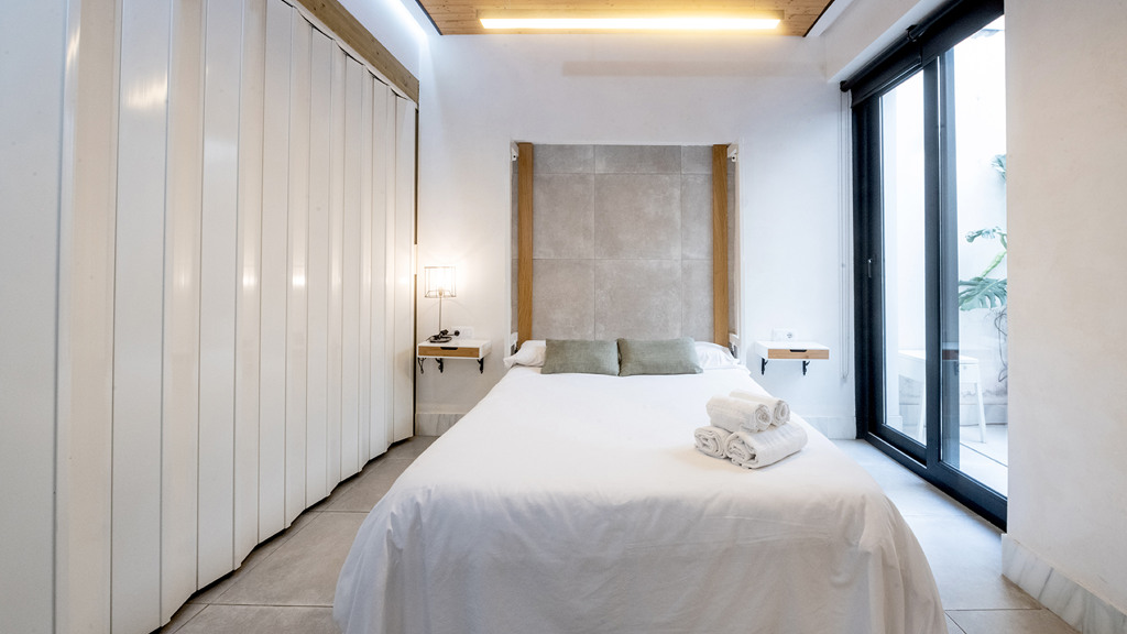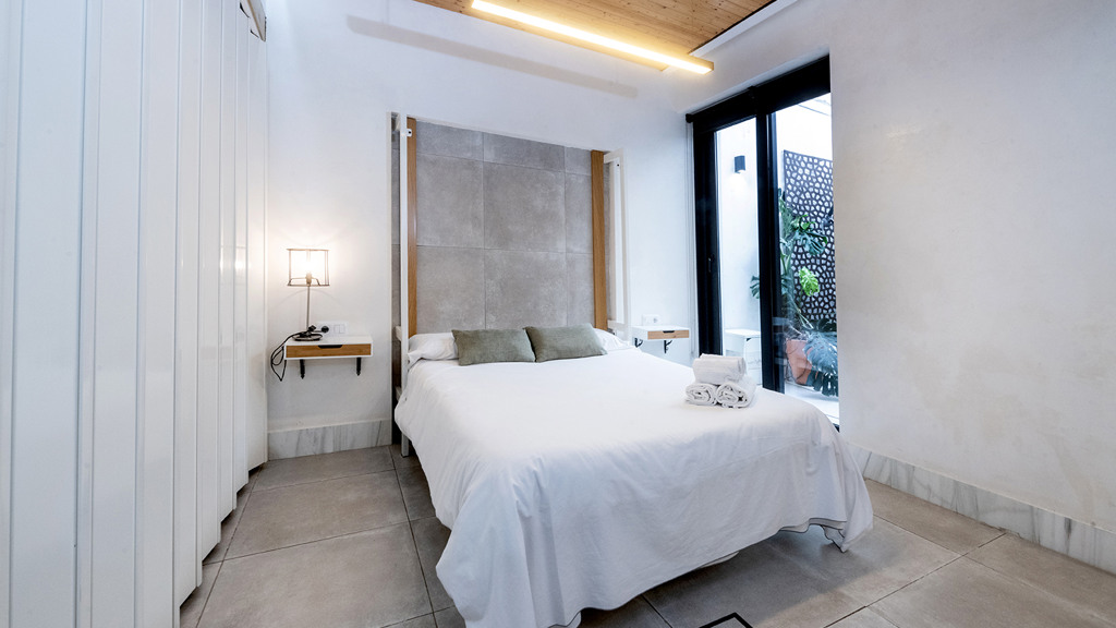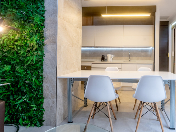 GILMAR presents an exclusive modern holiday flat in Seville’s vibrant Nervión neighbourhood with 54 square metres of living space. The completely refurbished interior radiates modern style and elegance, with an open concept kitchen equipped with state-of-the-art appliances that joins the dining area and a spacious living room. From the lounge there is a terrace with a small swimming pool and shower. It offers good qualities such as porcelain tiling on floors and walls, stucco, sliding doors and centralised air conditioning throughout the property.