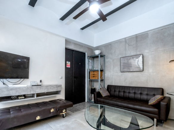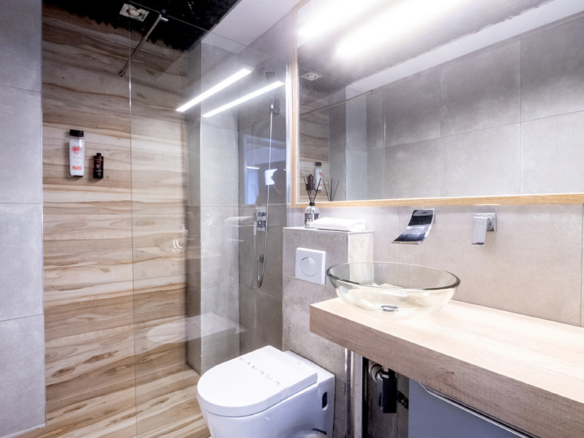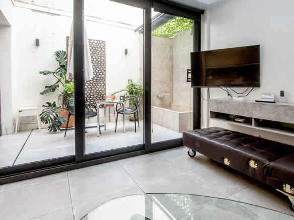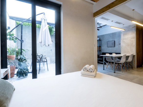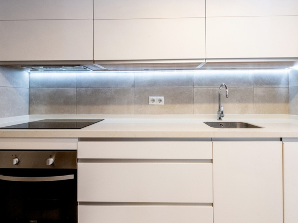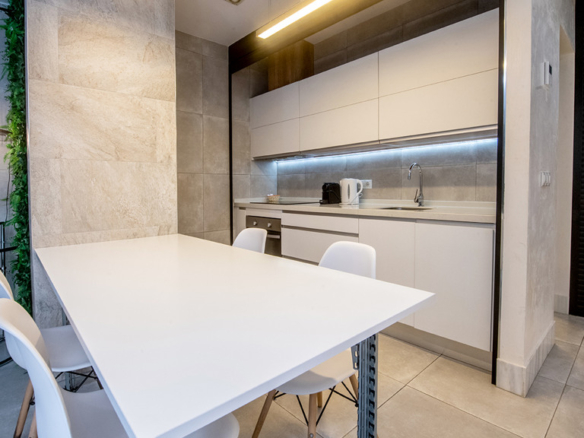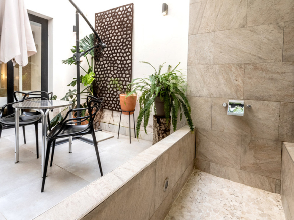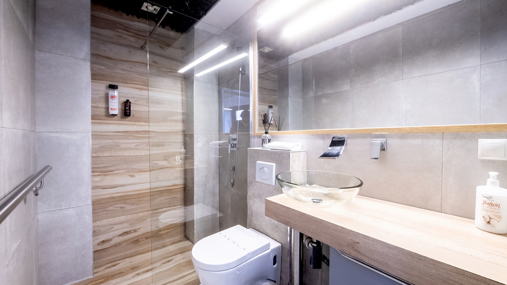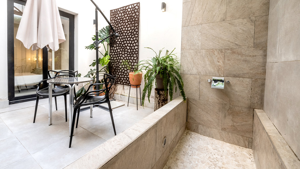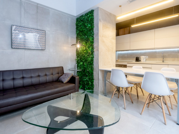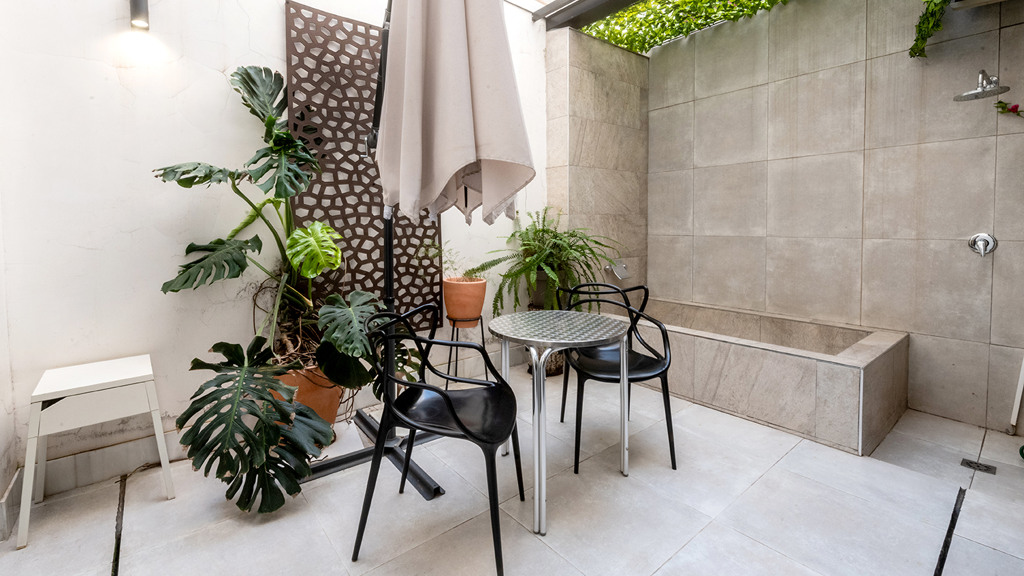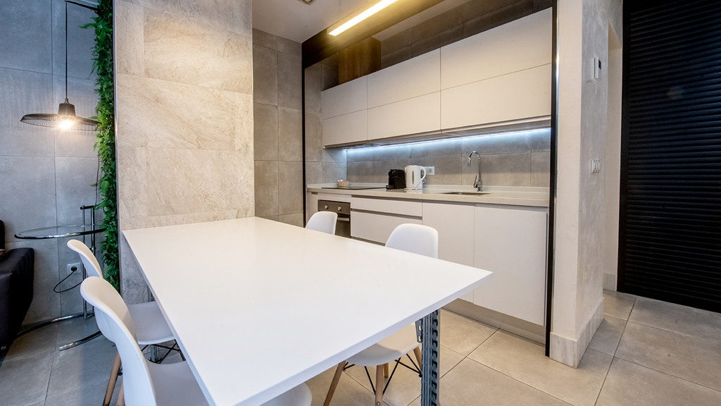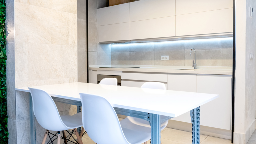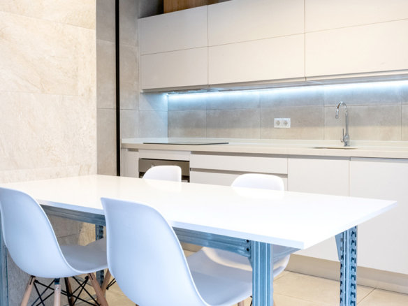 GILMAR presents an exclusive modern holiday flat in Seville’s vibrant Nervión neighbourhood with 54 square metres of living space. The completely refurbished interior radiates modern style and elegance, with an open concept kitchen equipped with state-of-the-art appliances that joins the dining area and a spacious living room. From the lounge there is a terrace with a small swimming pool and shower. It offers good qualities such as porcelain tiling on floors and walls, stucco, sliding doors and centralised air conditioning throughout the property.