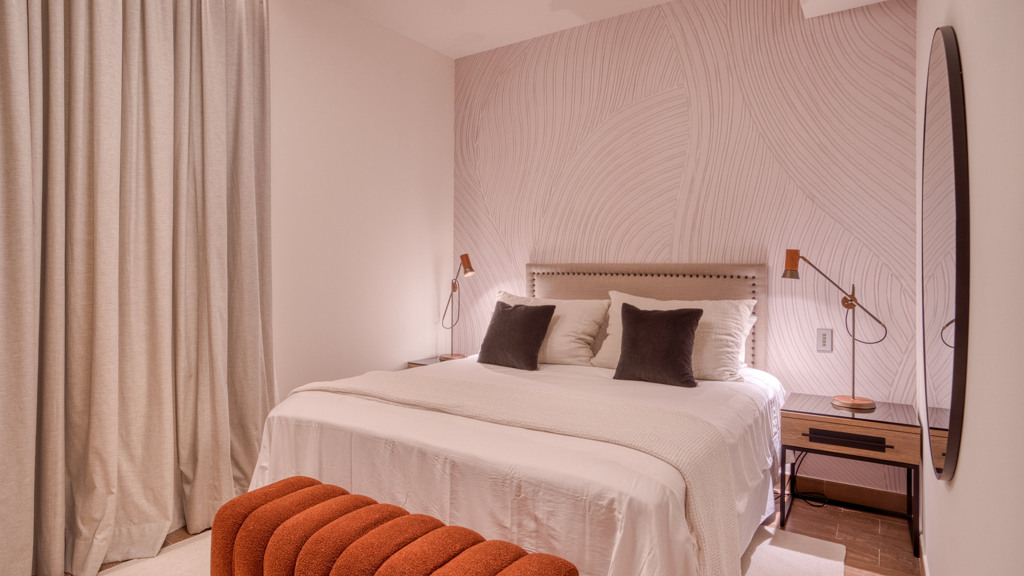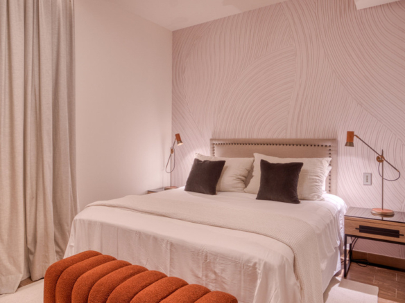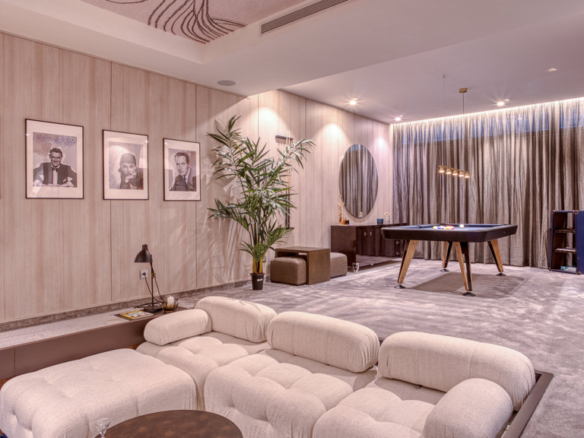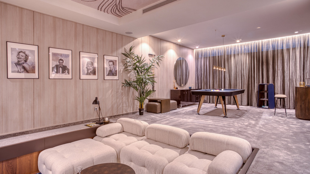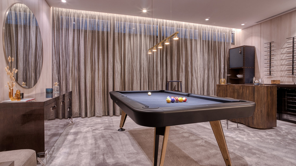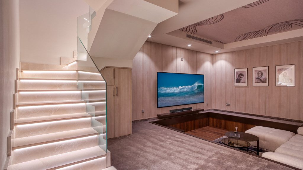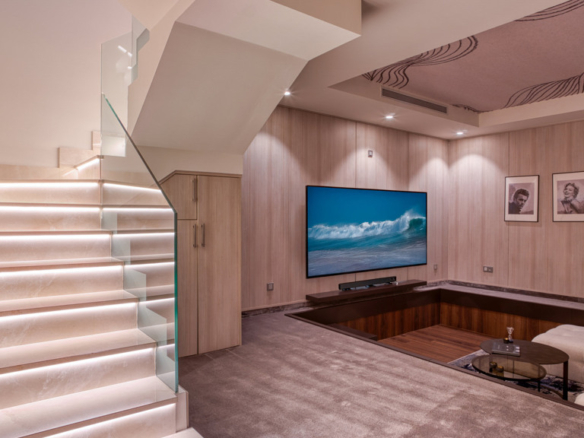 The lower-level leads to an additional bedroom, bathroom, laundry area and a unique cinema area with bar; a relaxing area for entertaining.