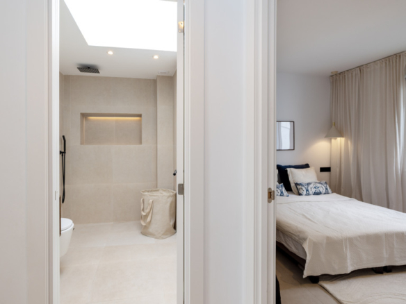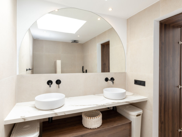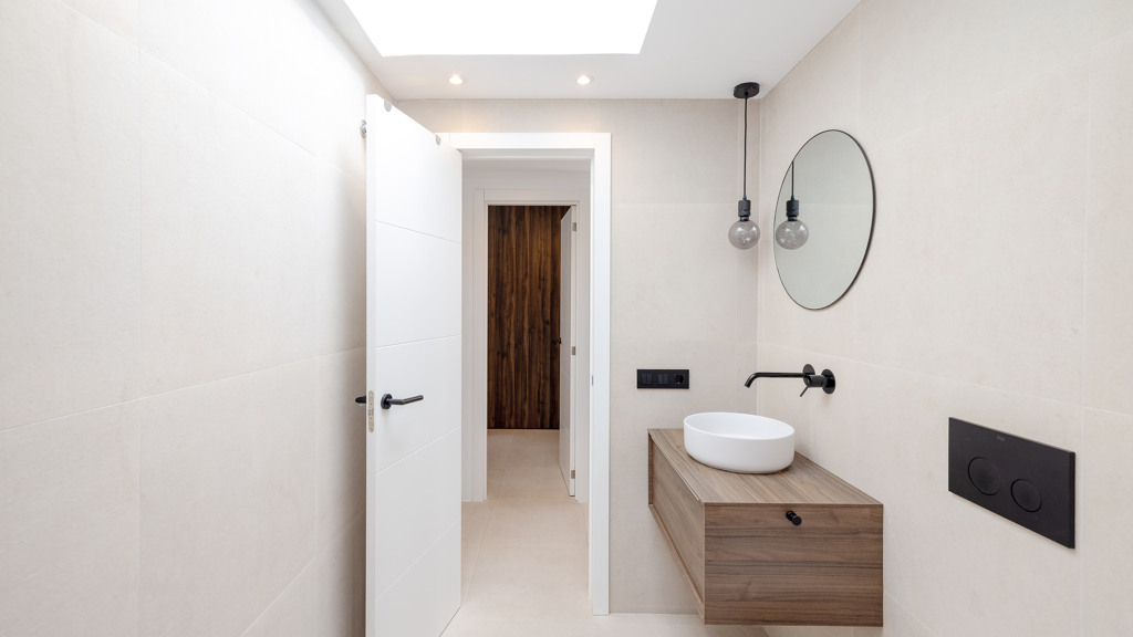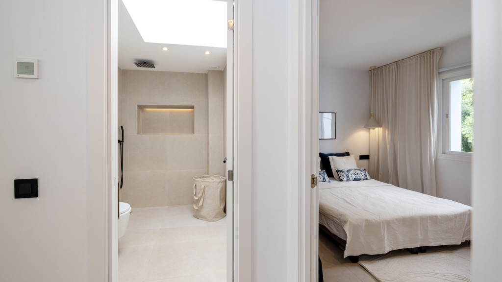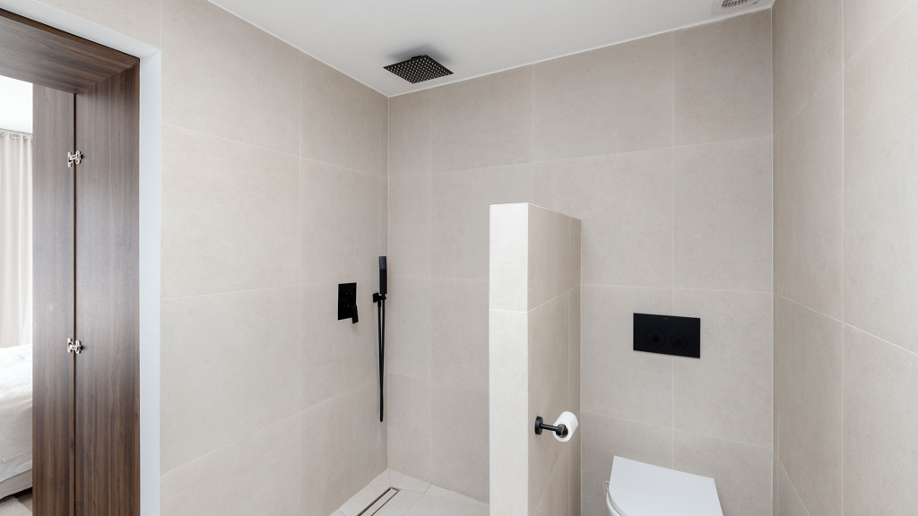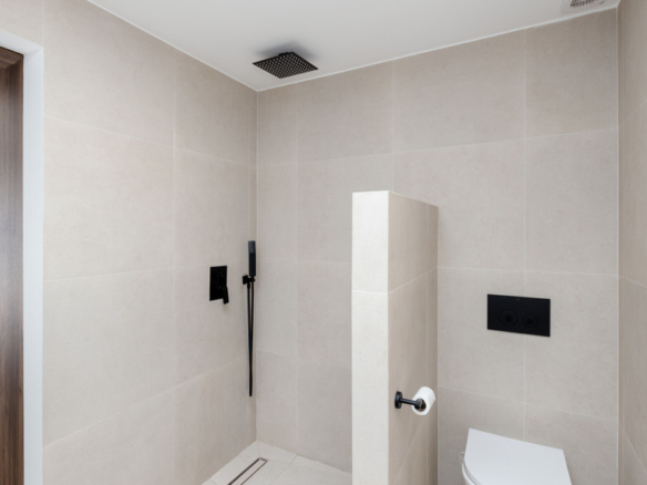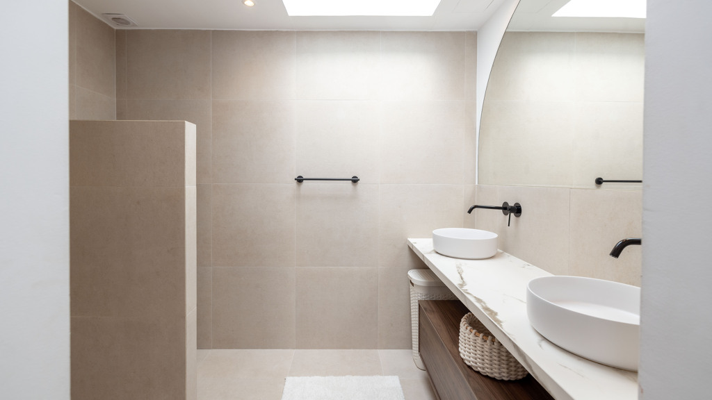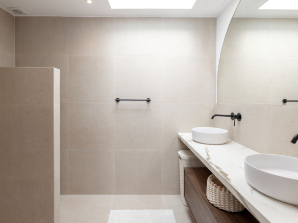 Matte black finishes and skylights in both bathrooms add a modern and aesthetically refined touch.