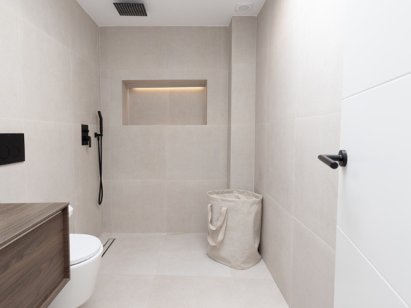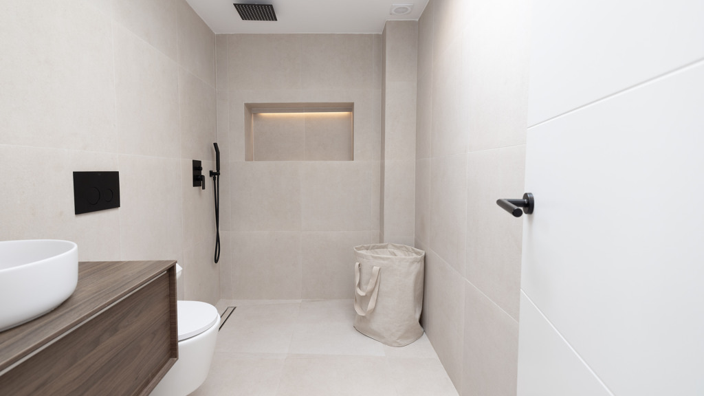 The design maintains harmony throughout the home with beige 60×60 porcelain tiles used consistently on the floors, bathroom walls, and outdoor areas.