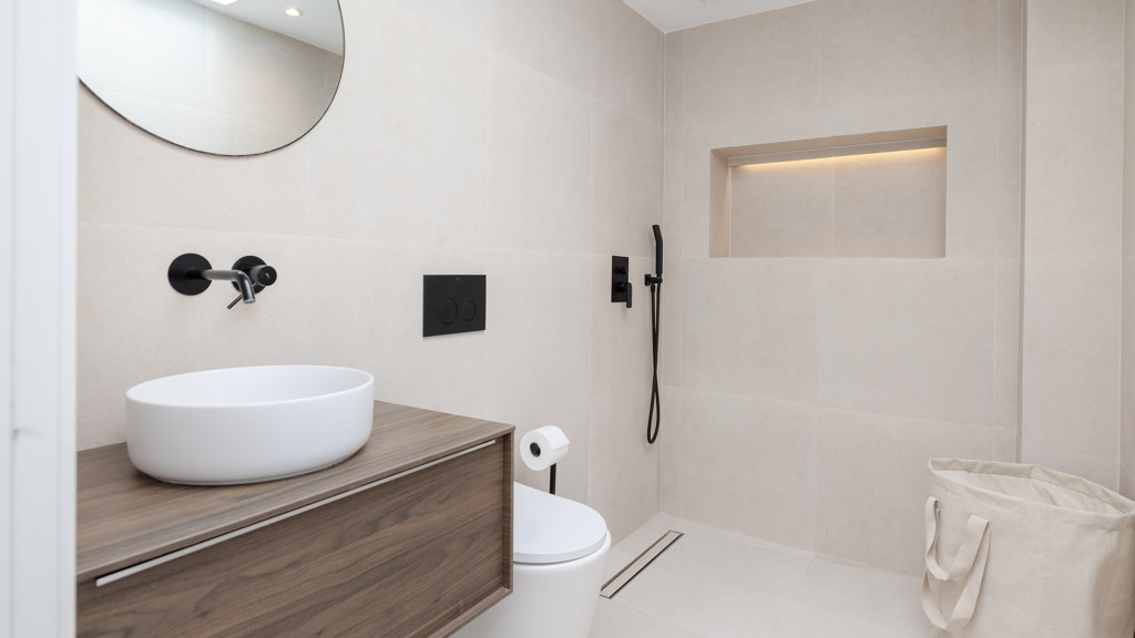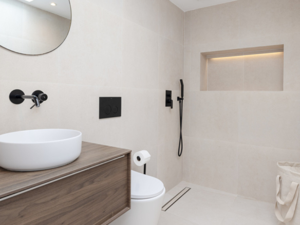 Matte black switches, faucets, and handles complete the modern and functional design.