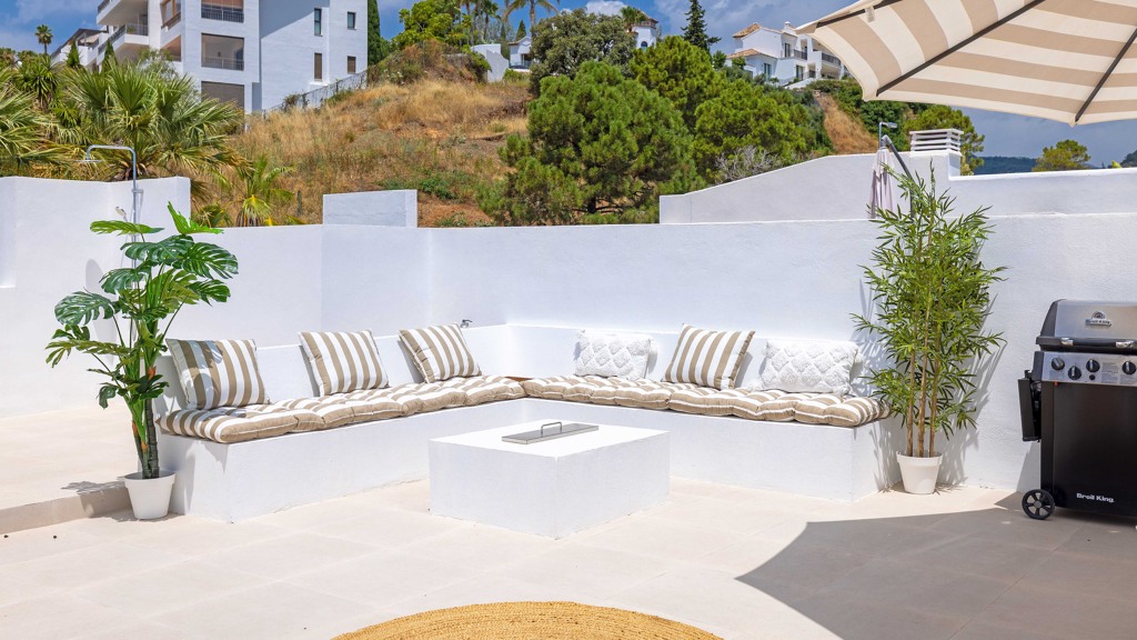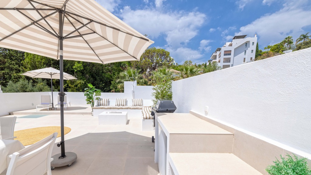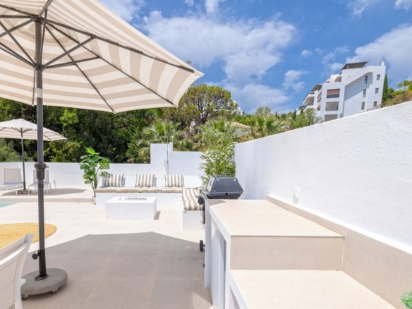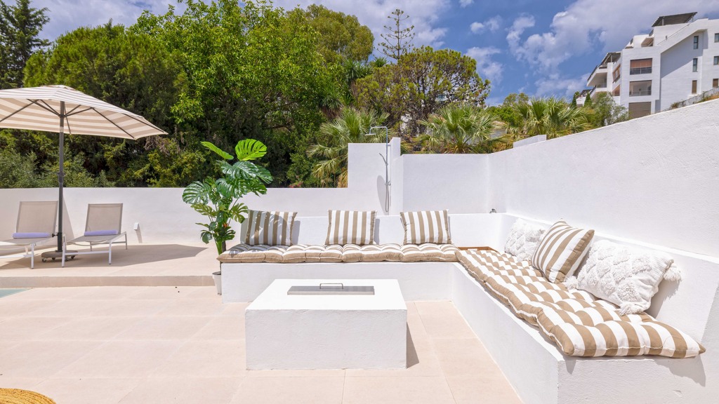The spacious area invites relaxation, featuring an outdoor shower, sunbathing zone, open-air kitchen, barbecue, and a fire table for those cozier evenings