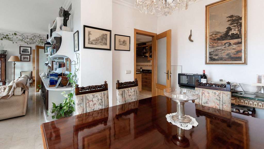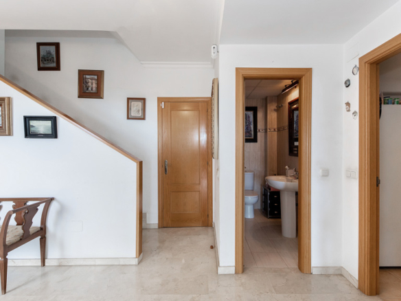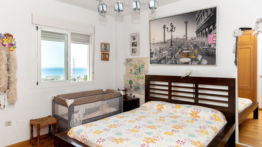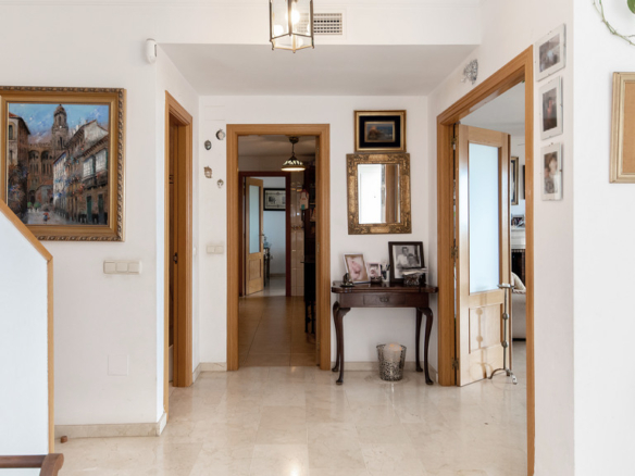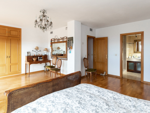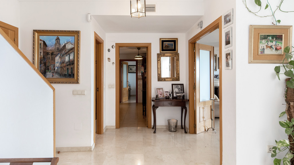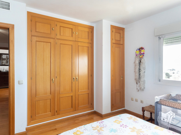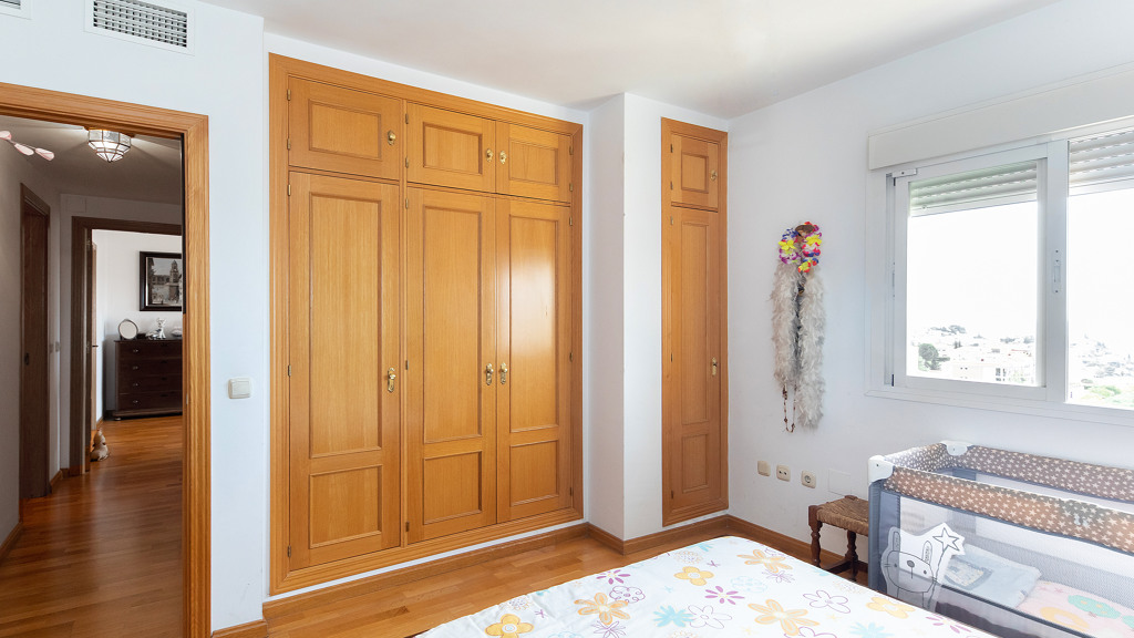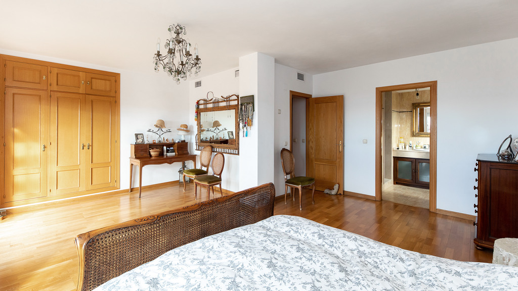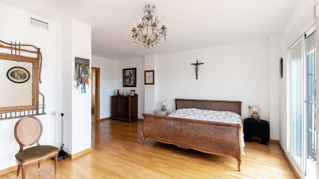 On the first floor we finde the bedrooms, they are two and of great size, one of them with dressing room and bathroom en suite. There is also an additional bathroom. The corridor has been used to make the most of the space by installing built-in wardrobes. From this floor there is access to the communal areas of the urbanization, where we find gardens for children to play and a communal swimming pool with good views.