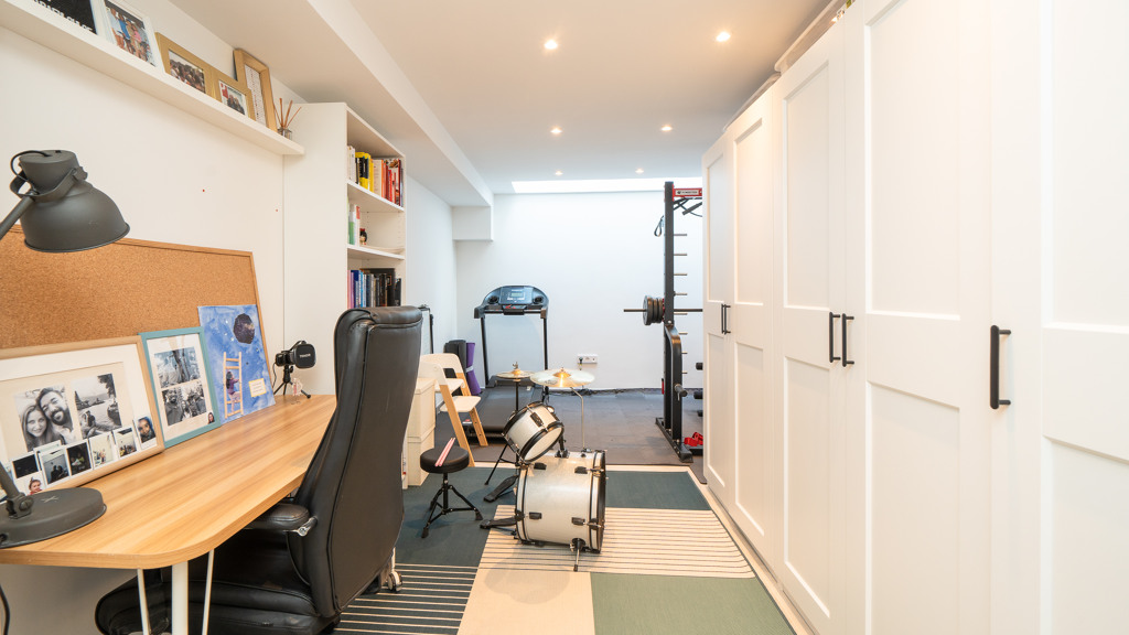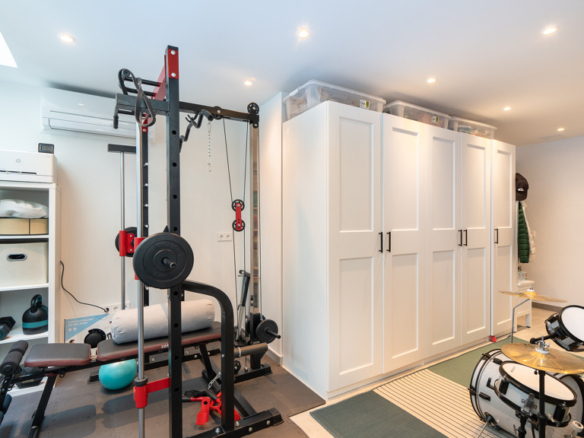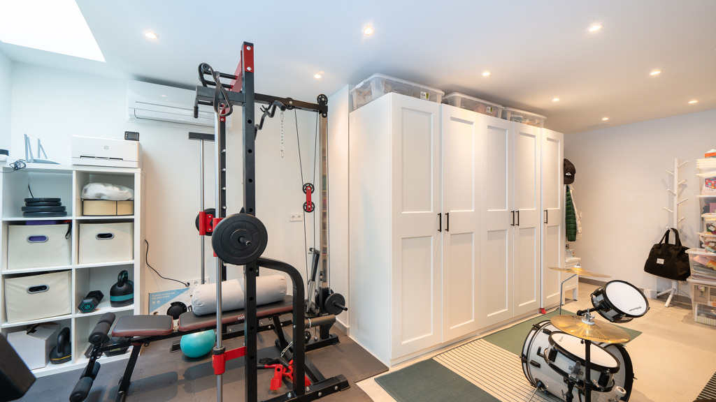 The property is distributed across four floors. On the first floor, you’ll find three bedrooms, including a master suite with a walk-in closet and en-suite bathroom, as well as two additional bedrooms sharing a full bathroom. The second floor offers access to a solarium—an ideal space to relax and enjoy the views. In the basement, there is a multipurpose room that can be used as a gym or office, along with a spacious garage with capacity for two vehicles and additional storage space.