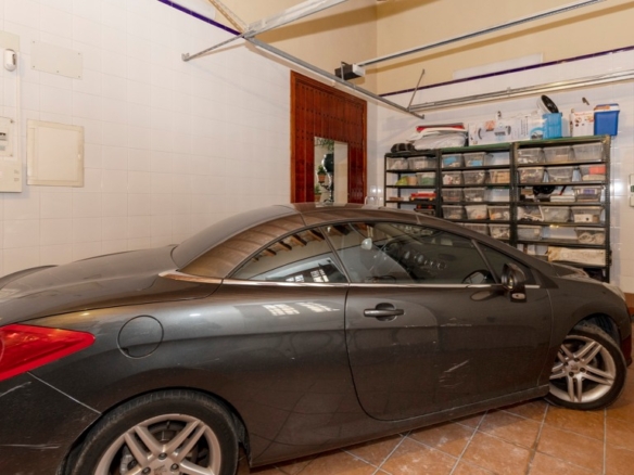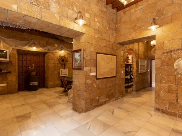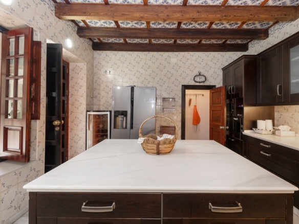 Ground floor: spacious entrance hall with high ceilings and exposed wooden beams leading to a large central courtyard around which the whole house revolves. There is a covered outdoor summer dining room and the courtyard can be bordered by a covered gallery formed by arcaded columns, decorated with ornamental flowers. Some of the walls have handmade tiles dating from the 15th century. The different rooms of the house that revolve around the courtyard are two large bedrooms, each with an en suite bathroom, air conditioning hot/cold, a large garage with access from the street through an automatic door, a separate kitchen with pantry and office, a large living room with four large windows, three facing the street and one facing the inner courtyard. The living room and dining room are separated into two areas by a beautiful wooden archway. Finally, there is a large room dedicated to the wine cellar, where there are several wine casks, a wine rack built into the wall, a refrigerator to keep the temperature of the wine bottles, a bar and a table to play cards.