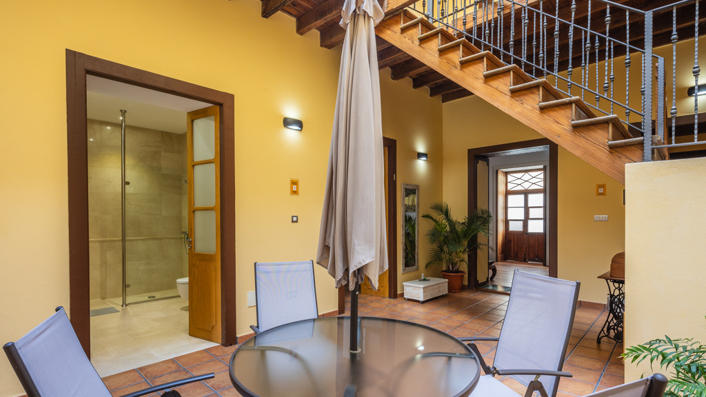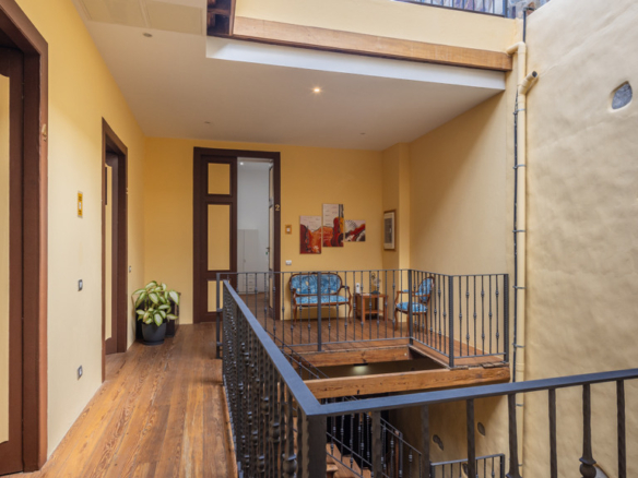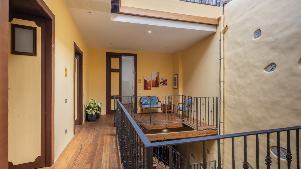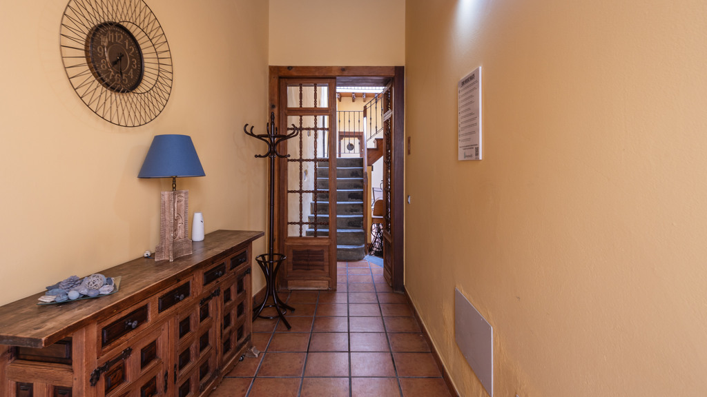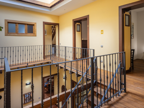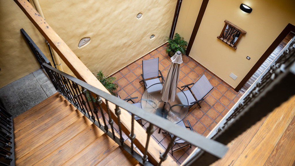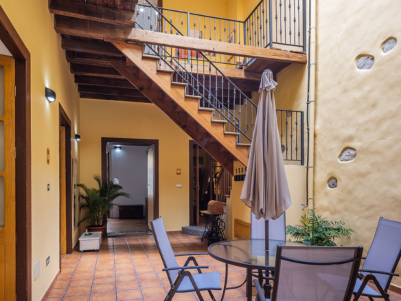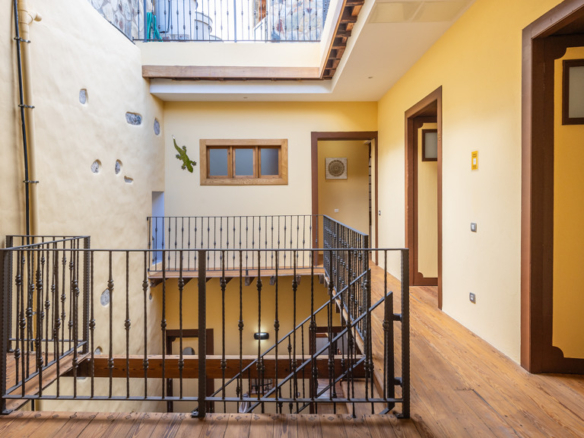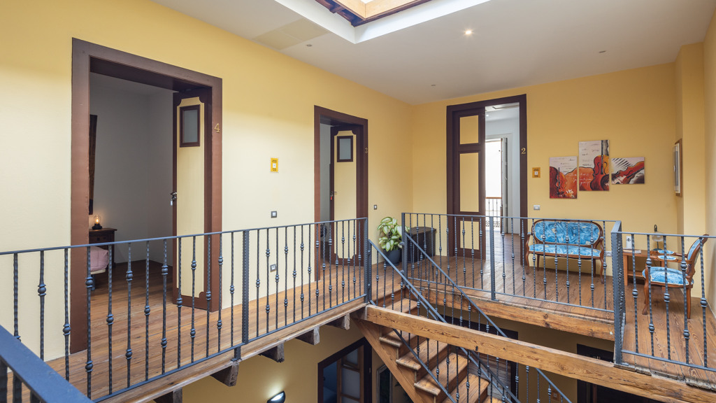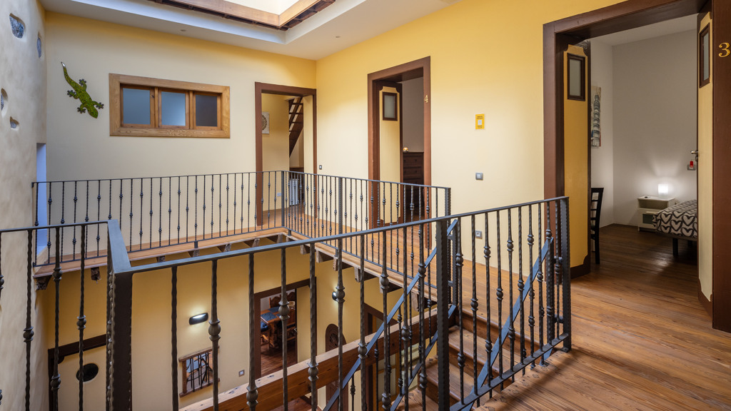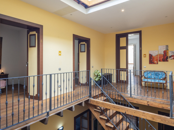 From the central courtyard and through a grey stone staircase, you reach an open gallery and from here, you can access the main part of the house. The main bedroom is a double room with access to another bedroom. Large windows and a wrought iron balcony allow light to enter each of the spaces in this area.