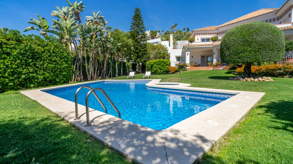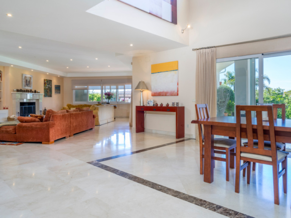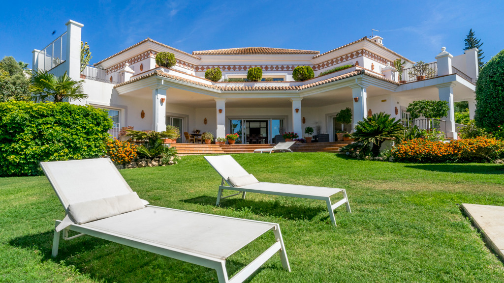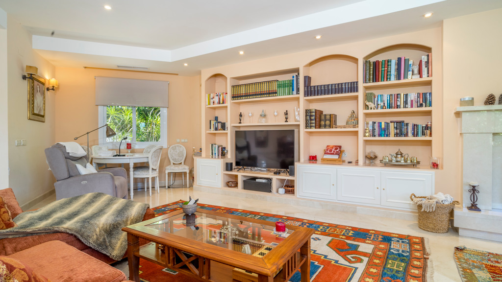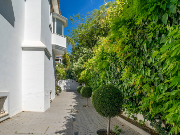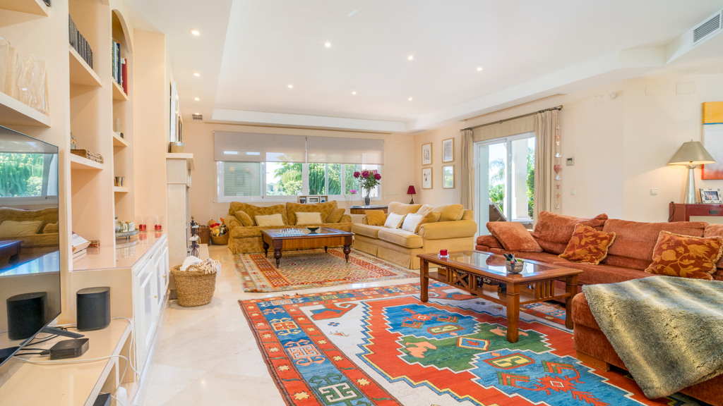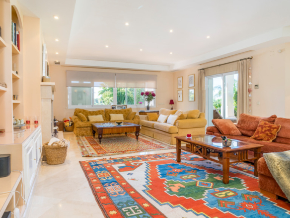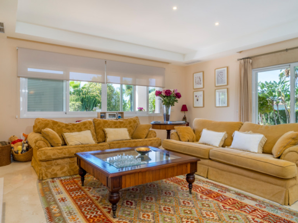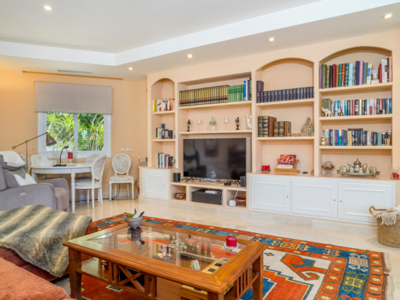 The east façade of the villa sits on a large, mature and immaculate sloping garden. An automatic sprinkler irrigation system nurtures the lush vegetation consisting of flowers as well as cacti, palms, frangipani, citrus, mango and avocado trees. The bedrooms and bathrooms overlook this beautiful garden that borders the fairways of the Atalaya golf course in full view, as well as a lake, the mountains and Hole 3.