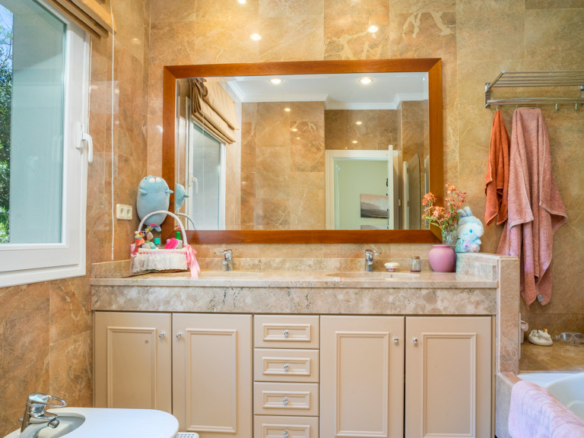 The main entrance leads into the reception area which also has a guest toilet, and beyond is the main open plan living and dining area. Large windows ensure that this area is very bright and cheerful and yet it is also protected from direct sunlight due to the covered terrace by the pool. On the same floor is a spacious kitchen which is very bright and also has direct access to the outside. The kitchen is connected to a laundry and ironing area as well as a covered drying area. On the other side of the living room, across the parquet floor area, are three en suite bedrooms and a dressing room.