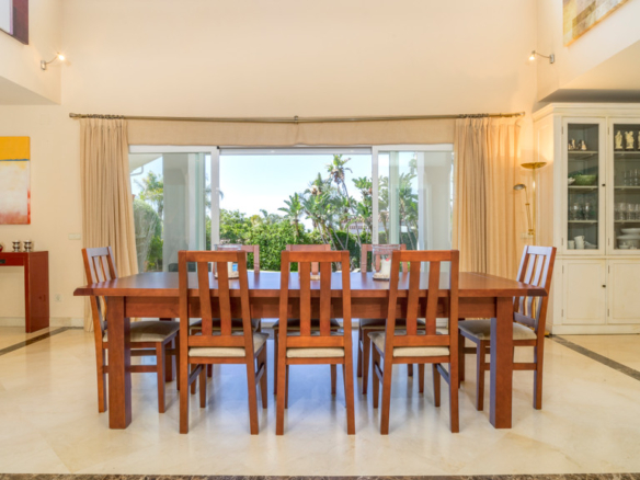 The villa is south facing, where a large shaded covered terrace overlooks the beautiful garden and swimming pool, as well as a Frangipani tree and an olive tree that is over 100 years old. Sea views can be enjoyed while sitting and dining al fresco on the terrace as well as from the outdoor living area which is accessed directly from the indoor living room.