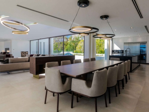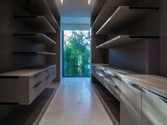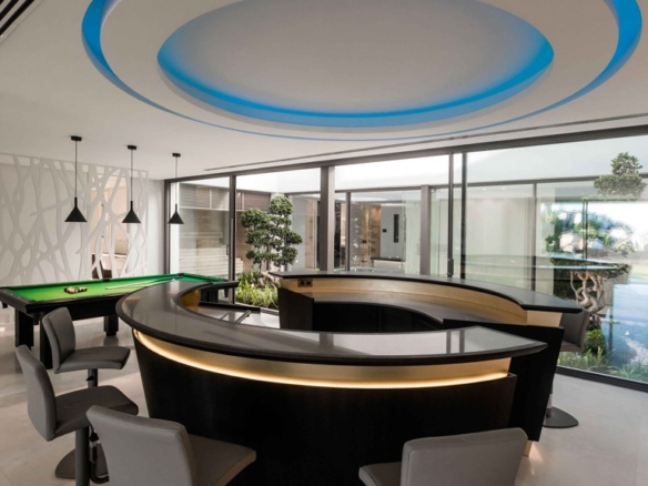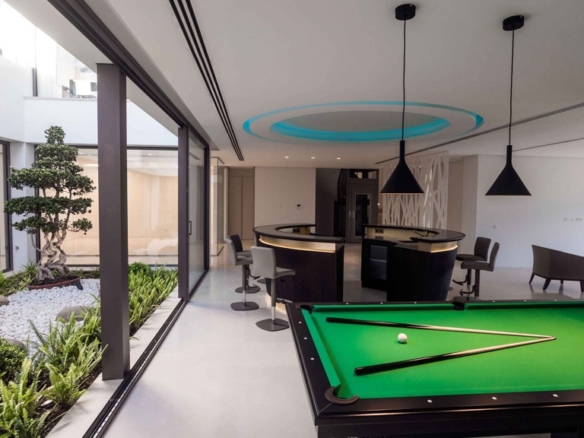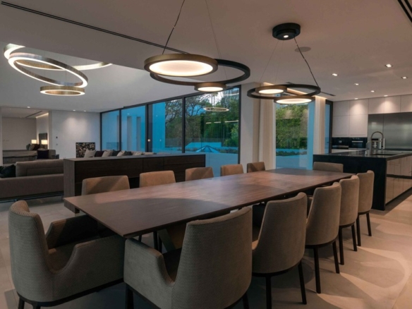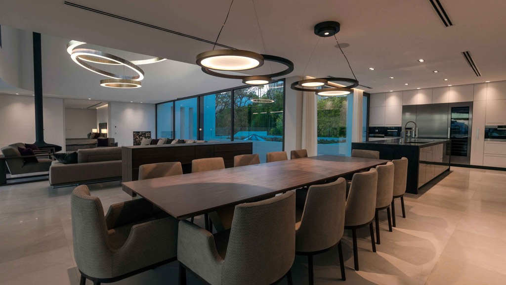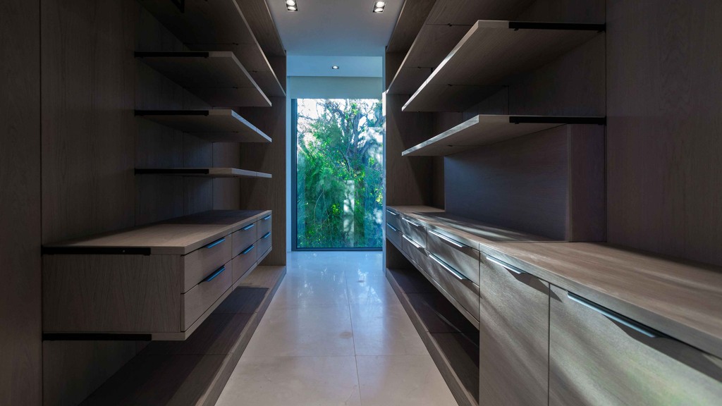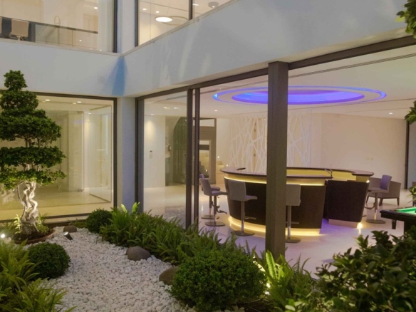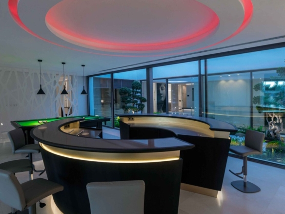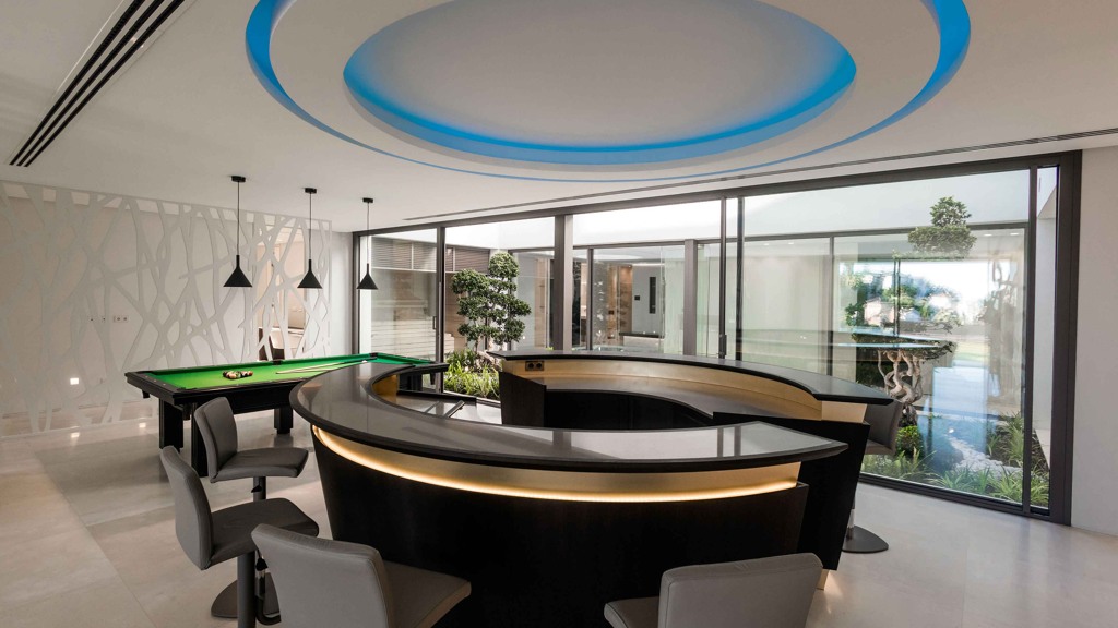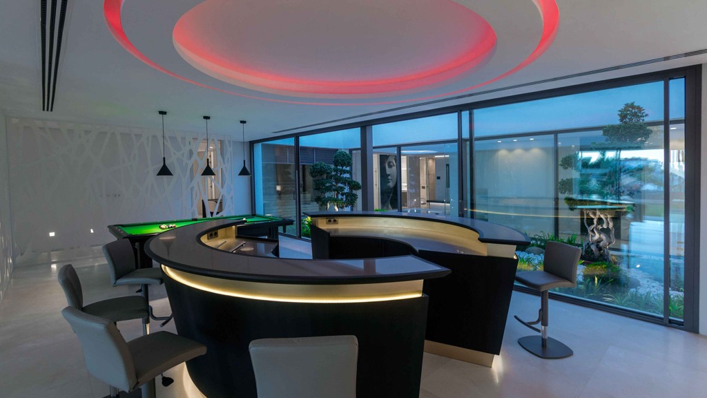 For your leisure moments, the house includes an interior walnut bar, an exterior bar with Dekton Vegha cladding, and a Weber barbecue. The impressive 19-meter Infinitypool and the pond with stainless steel shower are perfect for relaxation and entertainment.