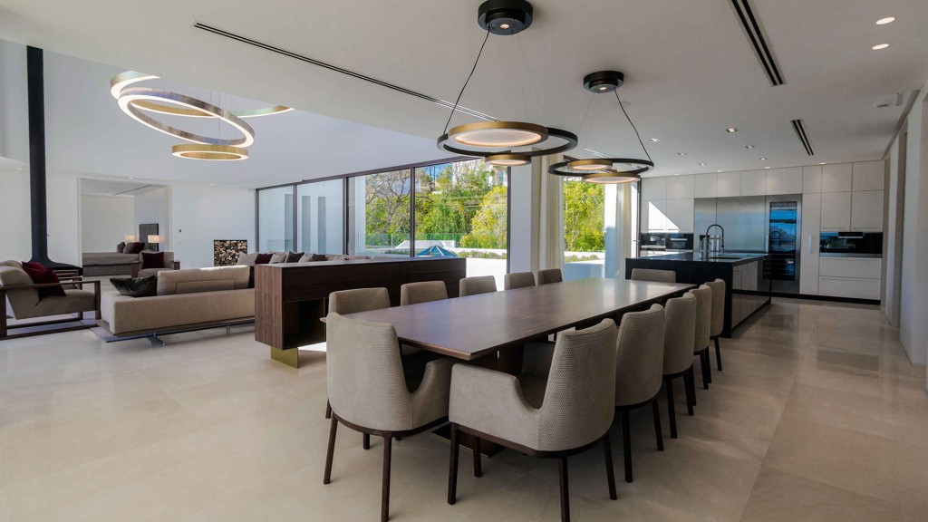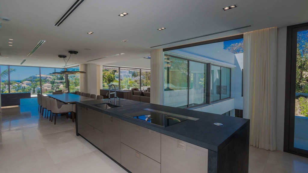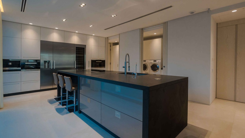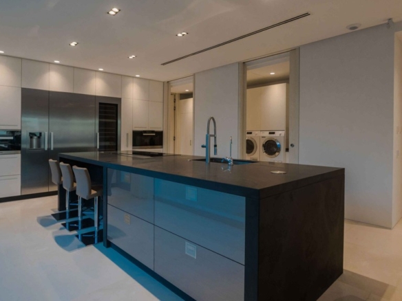 The kitchen, installed by DANESPAN, features Grand Canyon model doors in matte white and natural slate countertops. The MIELE and GAGGENAU appliances ensure a top-notch culinary experience.
