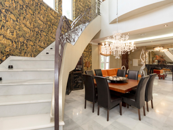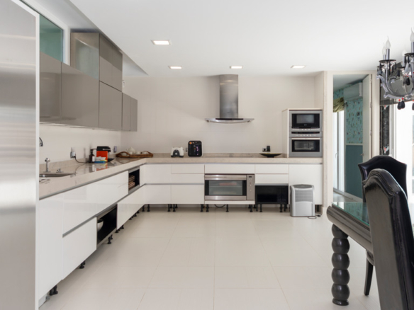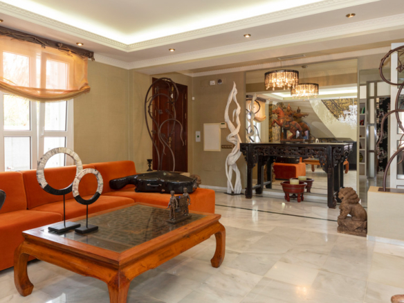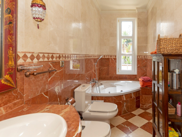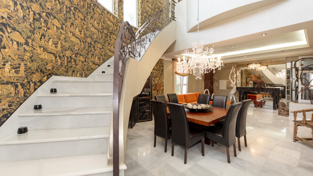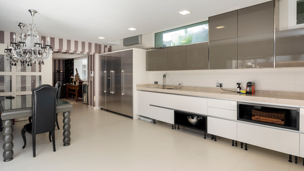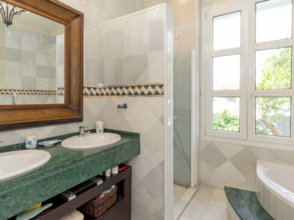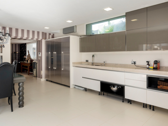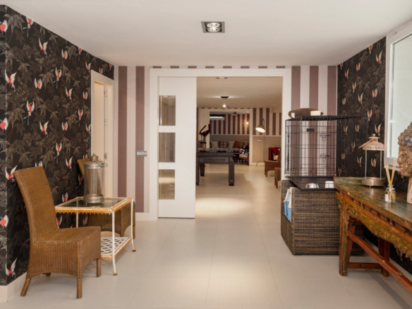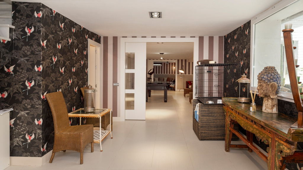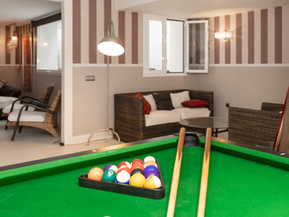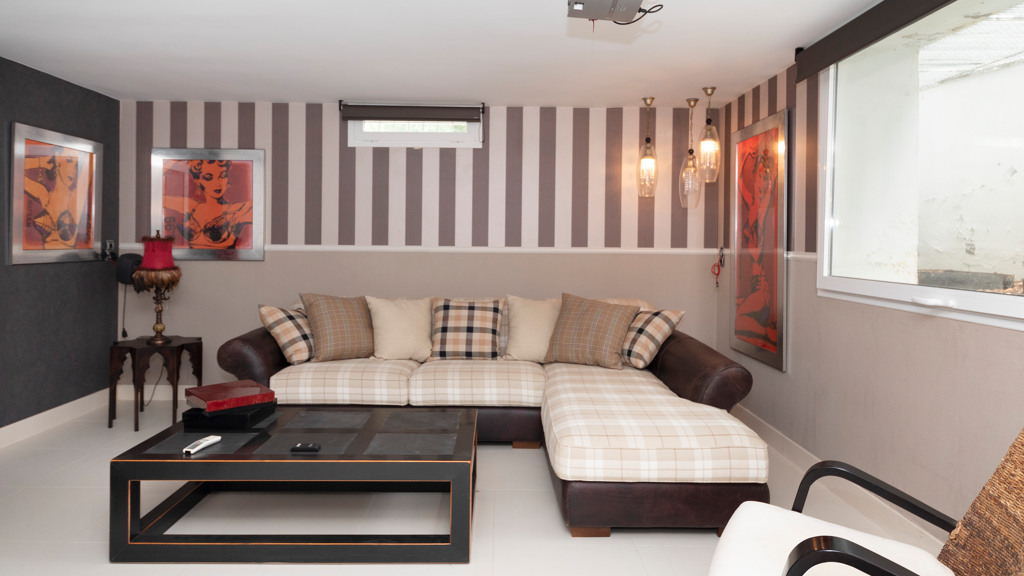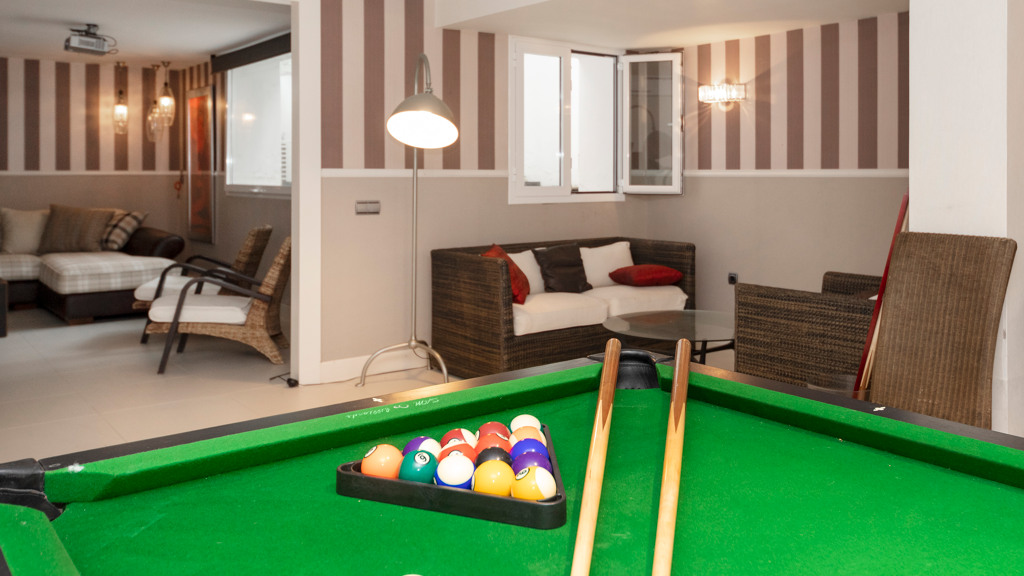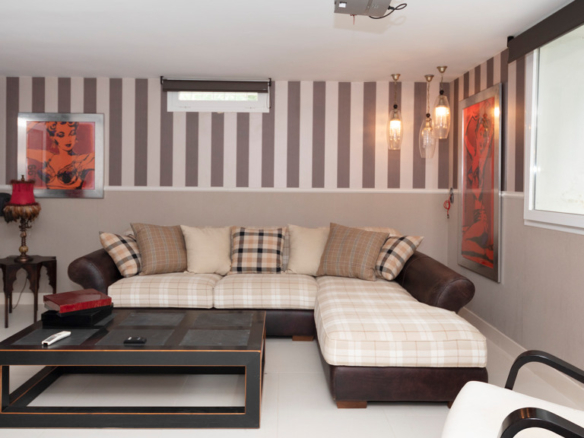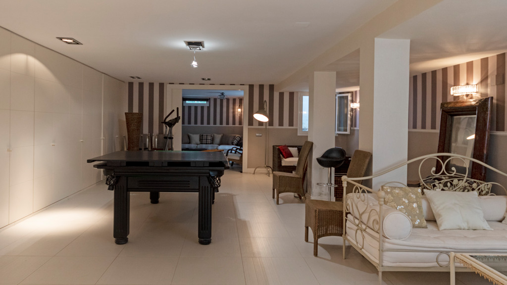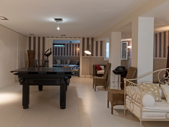 Semi-basement floor: hallway, a kitchen-dining room with access, through large windows with sliding doors, to an uncovered porch facing the swimming pool. A bedroom with en-suite bathroom which can be either for the staff or for guests and which has an independent entrance through the garden, an English patio which brings more light into the semi-basement, a guest toilet, a large multifunctional room which is currently used for games, the large front of which is entirely made up of built-in wardrobes. At the back is the cinema room with projector and 5.1 sound that can be left isolated from the rest.