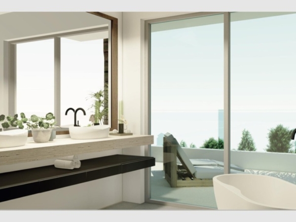 The architectural design of the villa harmoniously integrates with the natural surroundings, featuring expansive windows that provide panoramic views of the sea and the surrounding landscapes.