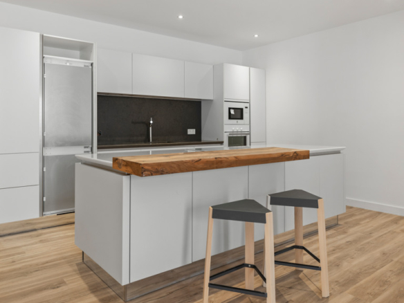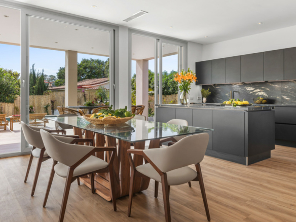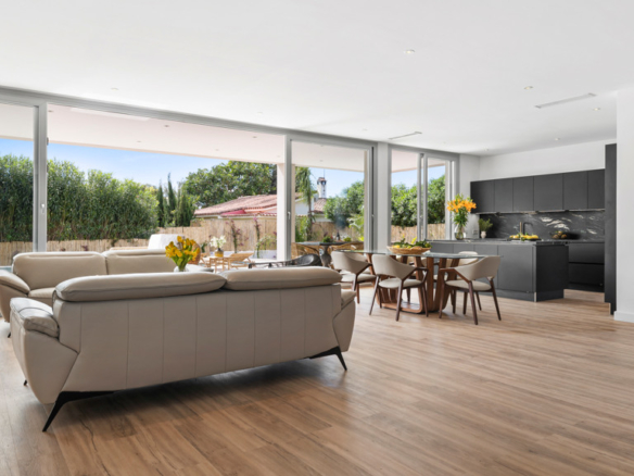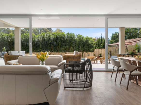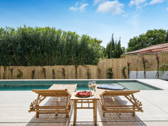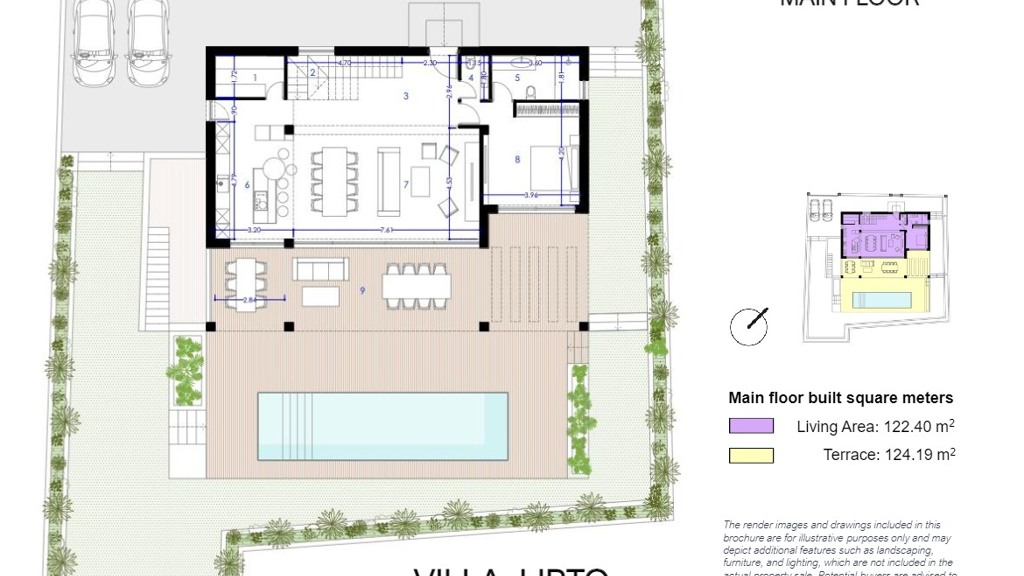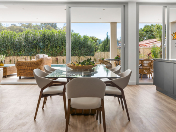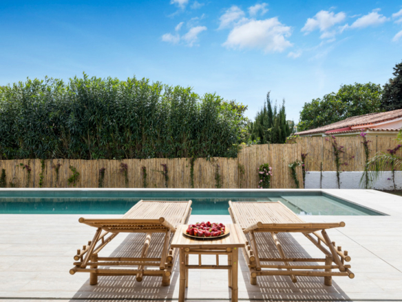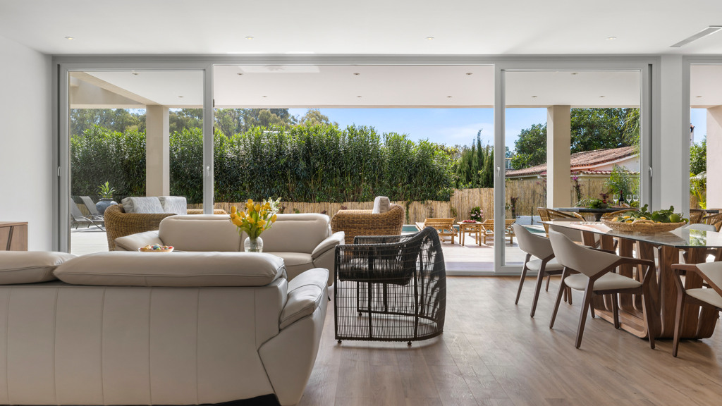 High-end features include air conditioning, underfloor heating, top-of-the-line appliances, and a private swimming pool. The property also includes a large covered garage and additional outdoor parking.