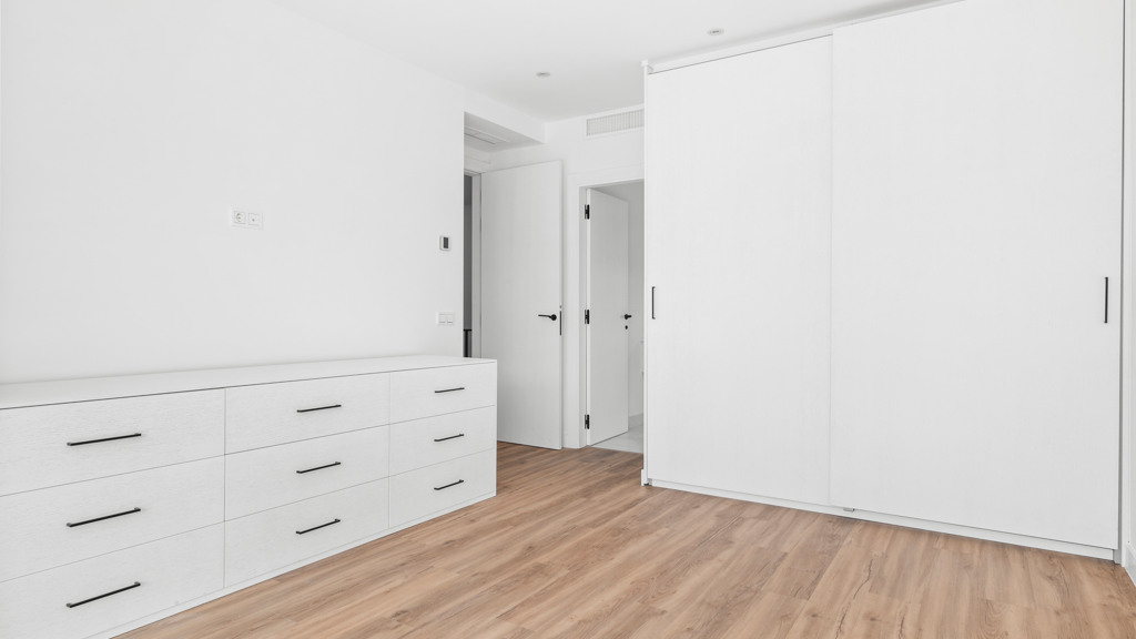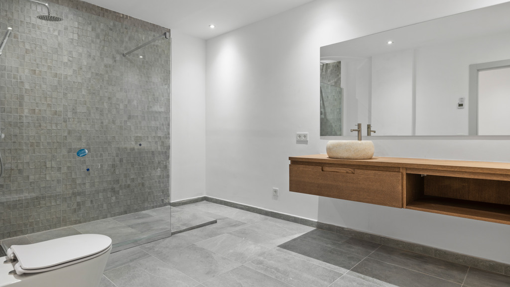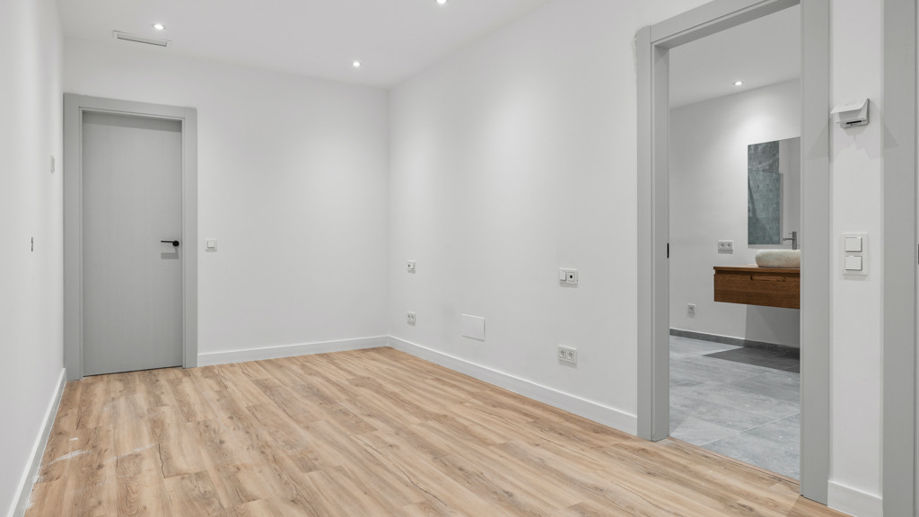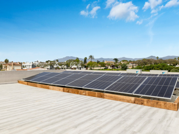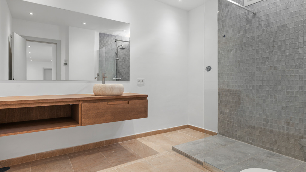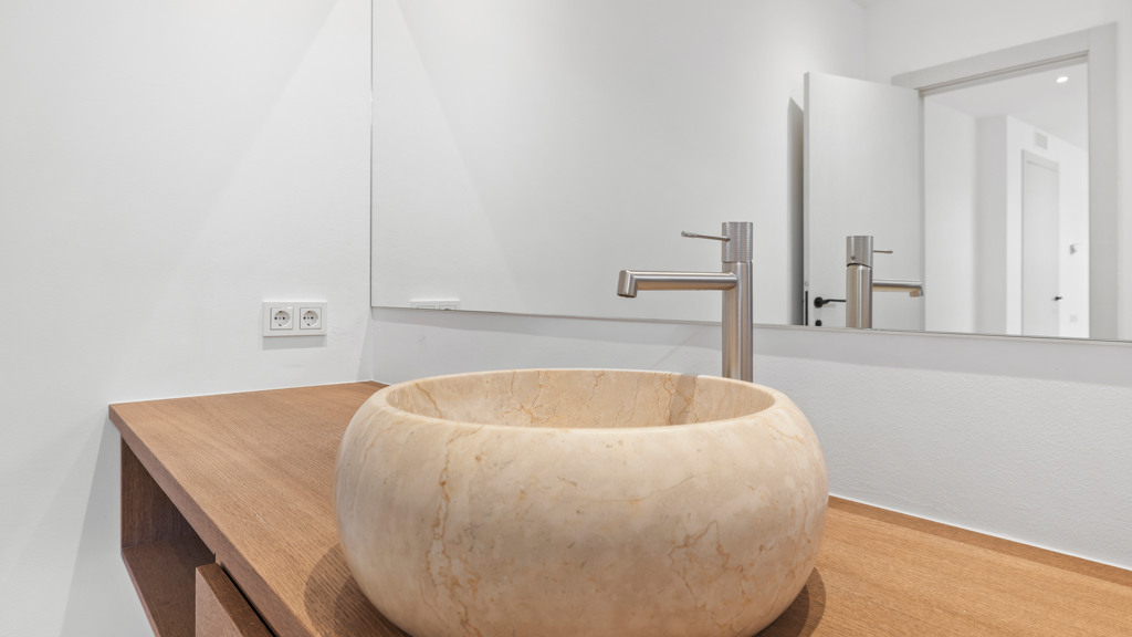 The upper floor houses an impressive master bedroom with a private bathroom that includes a bathtub, double sink, and elevated faucets. This master bedroom also features a spacious dressing room and a private terrace with areas for sunbathing and relaxation. Additionally, on this level, there is an additional guest bedroom with an ensuite bathroom.