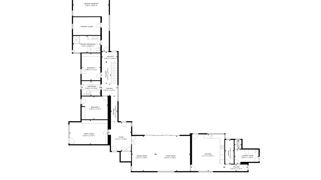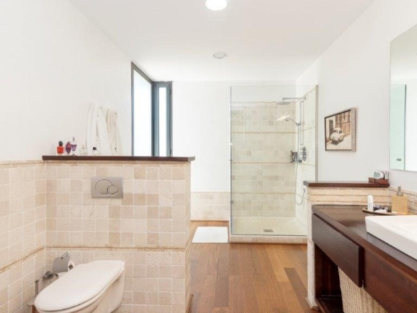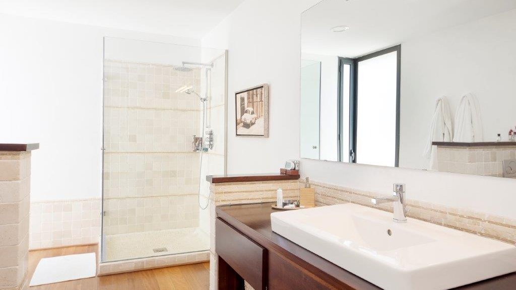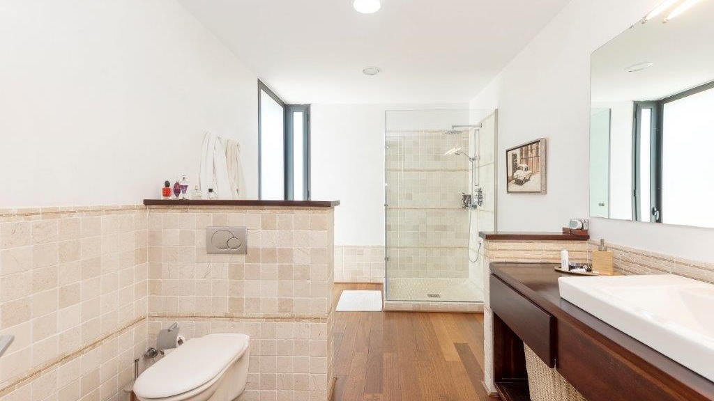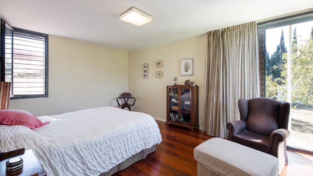 The house has a total of five bedrooms, three bathrooms (with Villeroy Bosh sanitary ware and taps) and a guest toilet at the entrance. One of the bedrooms is used as an office and three others are located in the same wing as spacious bedrooms: the master bedroom with dressing room and private bathroom, two other bedrooms with fitted wardrobes.