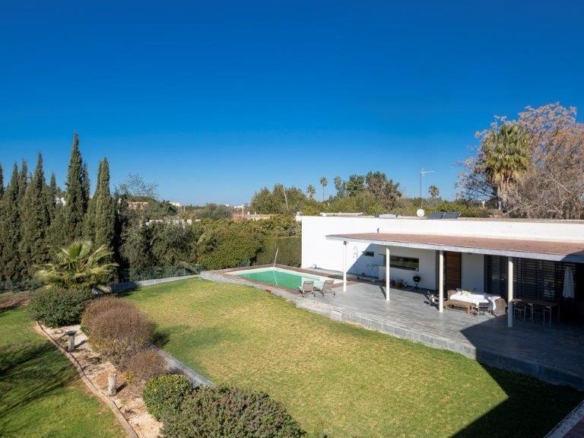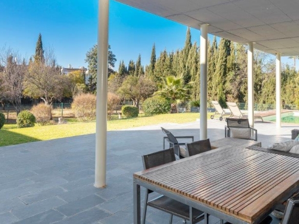 Large porch with swimming pool-solarium, which presides over the garden areas and direct entrance to the spacious living-dining room and from there to the large fully equipped kitchen-diner with high-end appliances and a service area with large pantry, laundry room and drying porch.