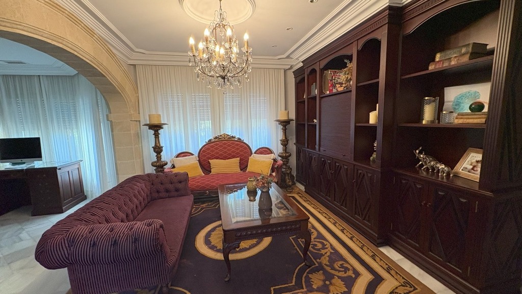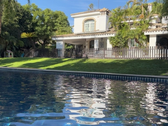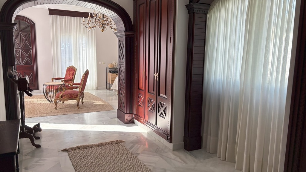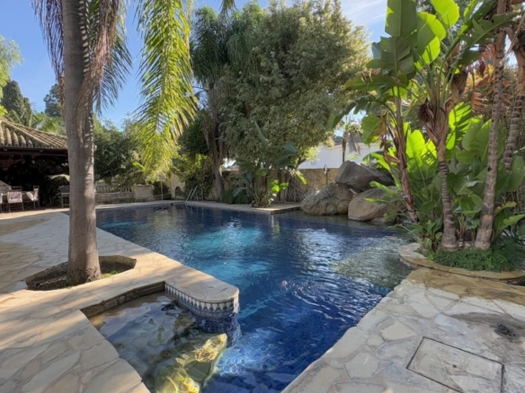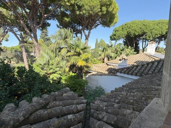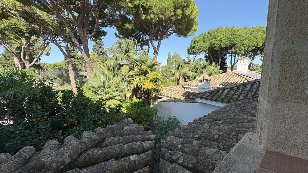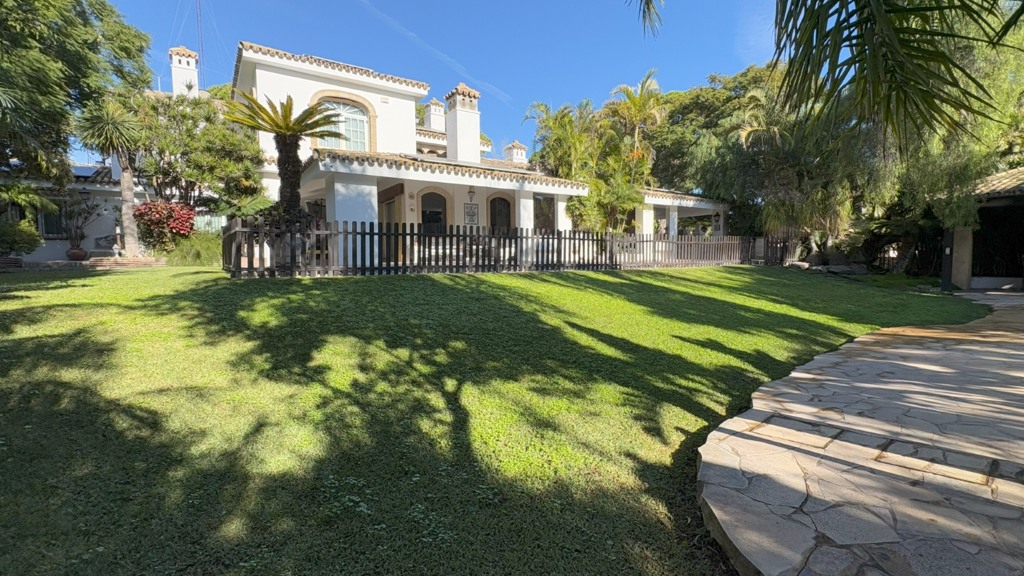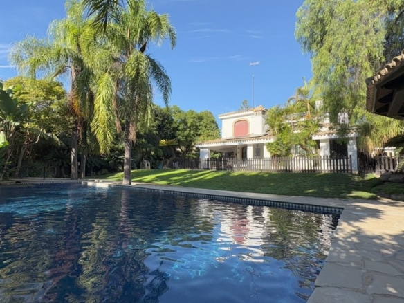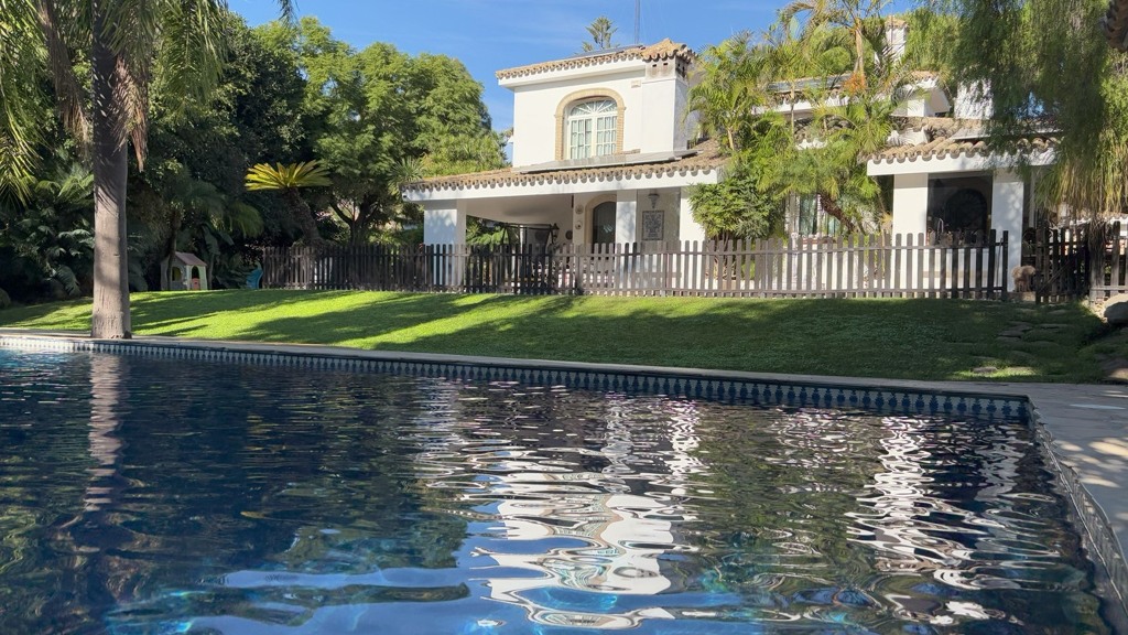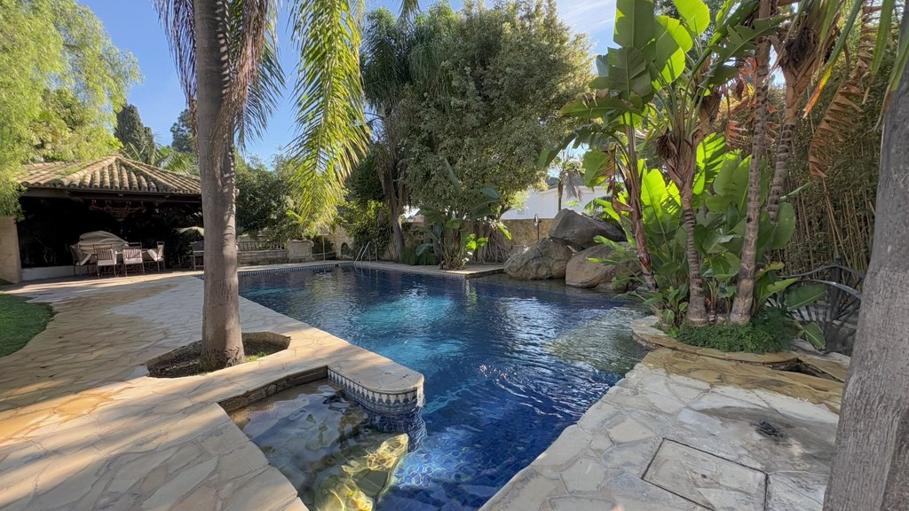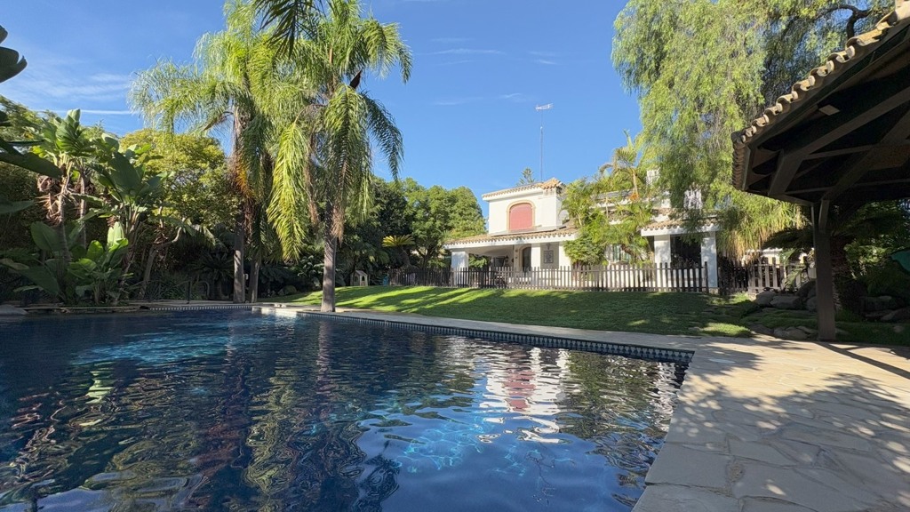 Gilmar offers you this impressive property located in the prestigious urbanization of Vistahermosa. This majestic property has a total built area of 700 square meters on a plot of over 2,000 square meters. The plot forms a small hill, with the house located at the top and towards the back. It consists of two houses. The main house, with two floors, has 6 bedrooms and 5 bathrooms, and is surrounded by a highly landscaped garden, with exotic species of palm trees and different classic ornamental elements, such as fountains and ceramics from Guadarte and Mensaque. In front of the porch, there is a pleasant swimming pool with summer dining area. Next to it, and built underground, there is a nice changing room with toilet that will surprise you with its originality.
