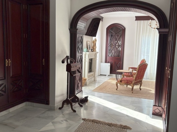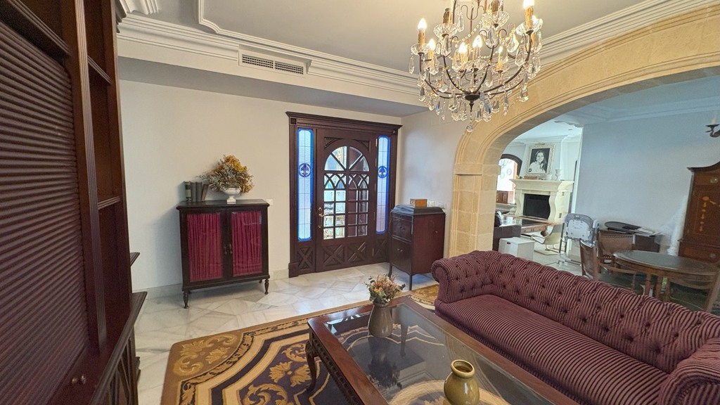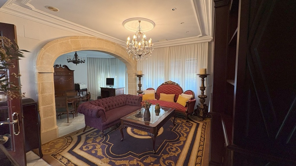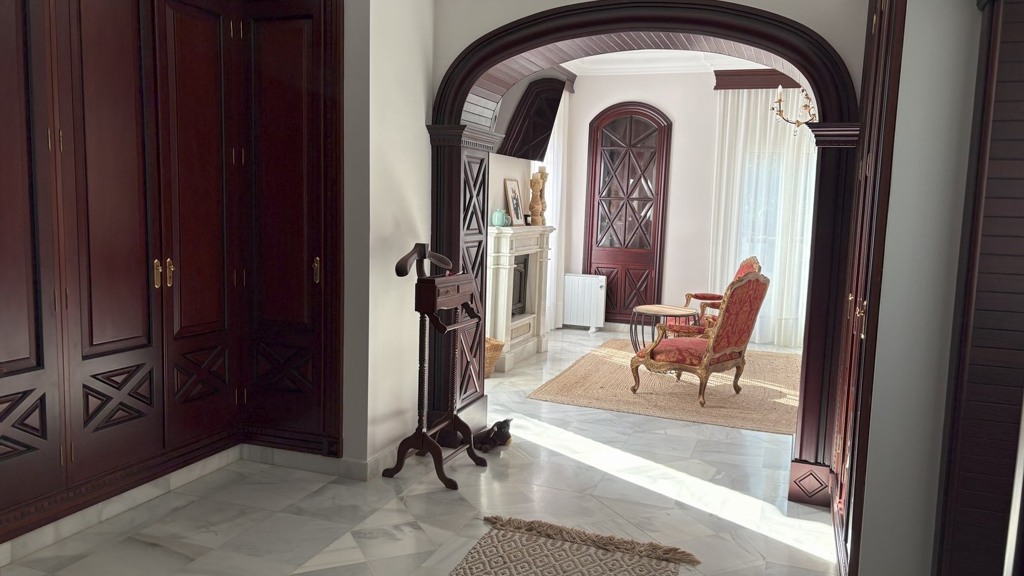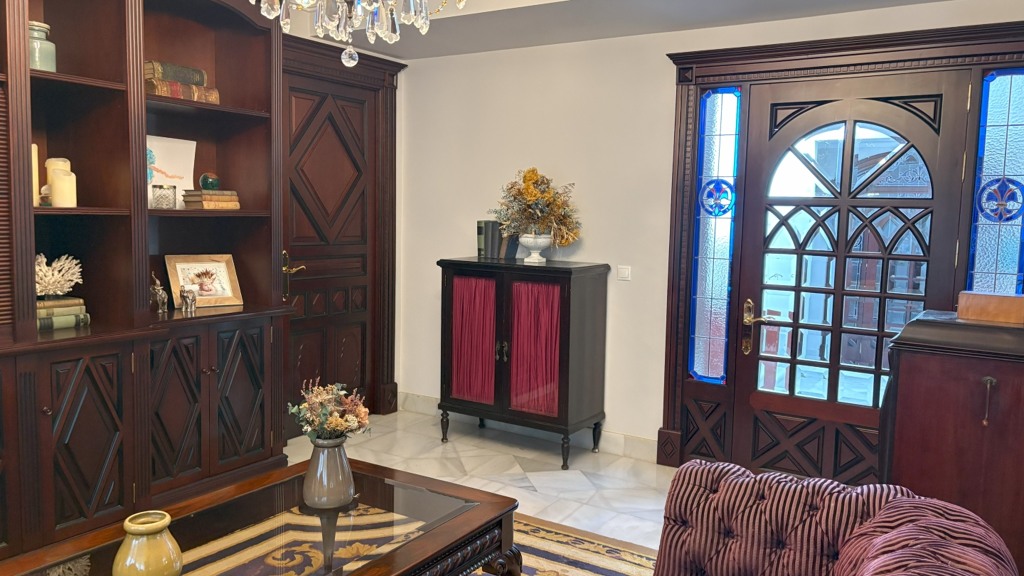 The main house impresses from the first moment with a spectacular entrance hall, where the high coffered ceilings and the windows with chrome-plated stained glass windows immediately catch the eye. All the interior carpentry is in mahogany hardwood.