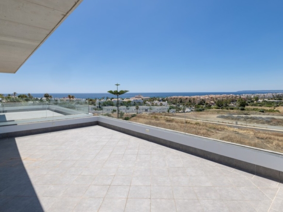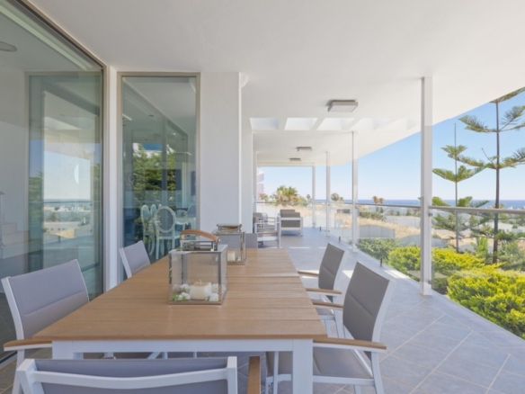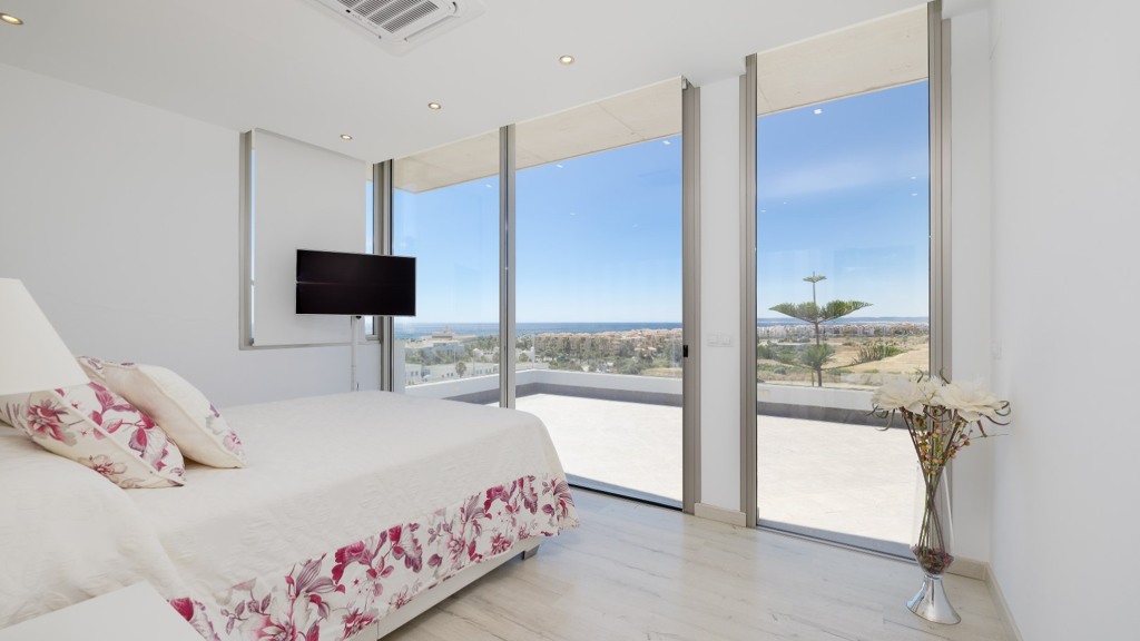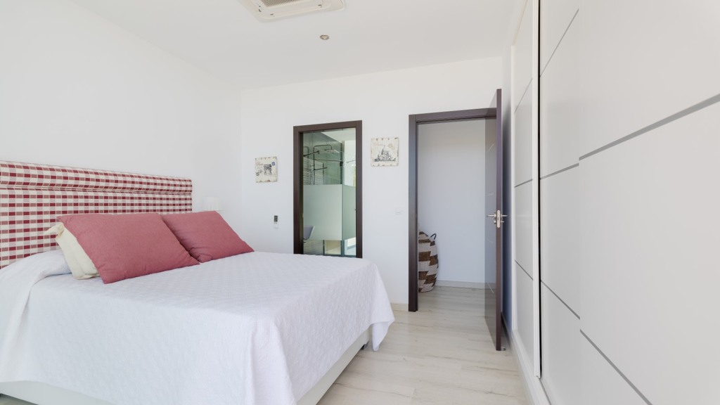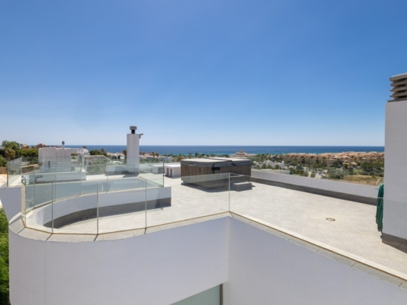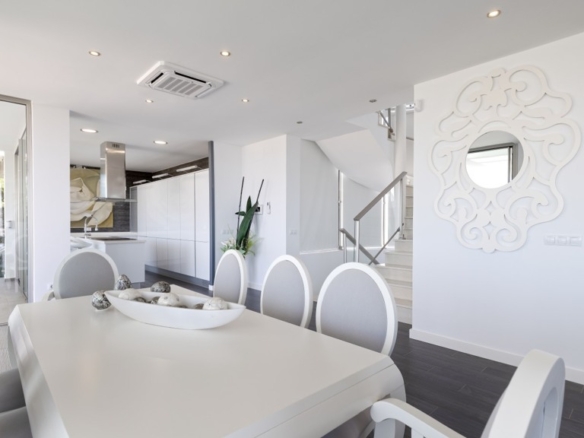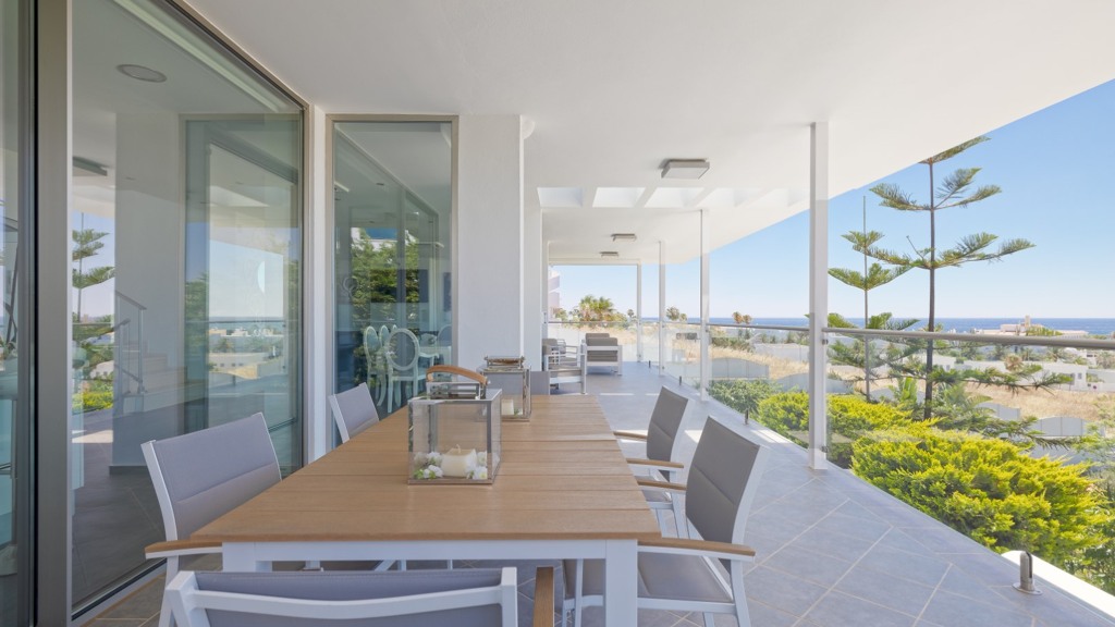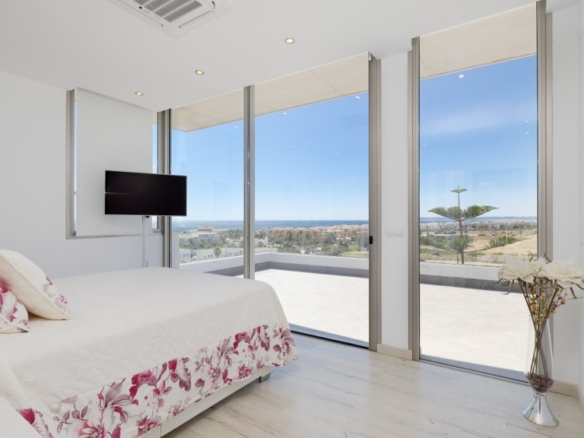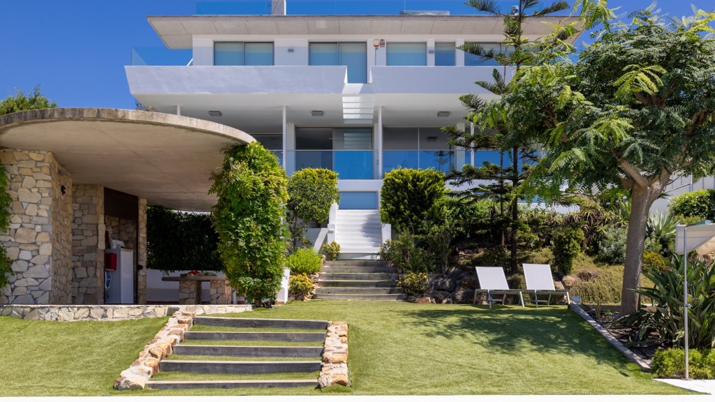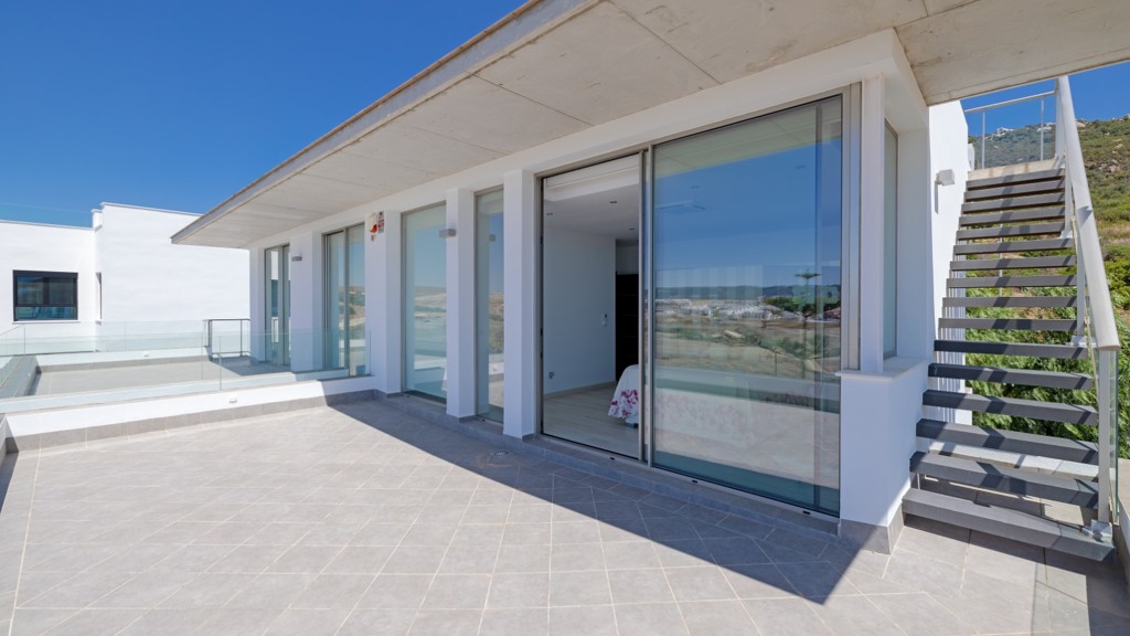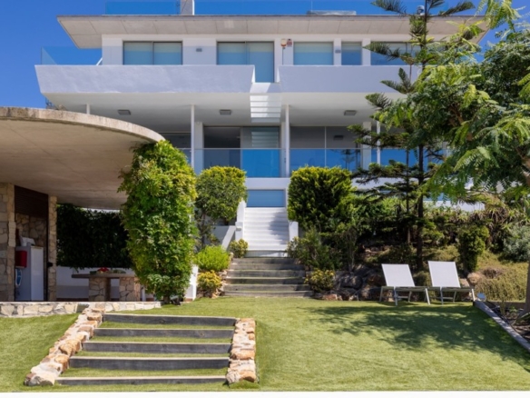First floor: accessed via a glazed spiral staircase with views of the mountains. This floor consists of three large bedrooms, all with views of the sea and the mountains, with en-suite bathrooms and access to a terrace. Two of them have access to a large communal terrace and the other bedroom, the master bedroom, also has a dressing room and access to a private terrace.