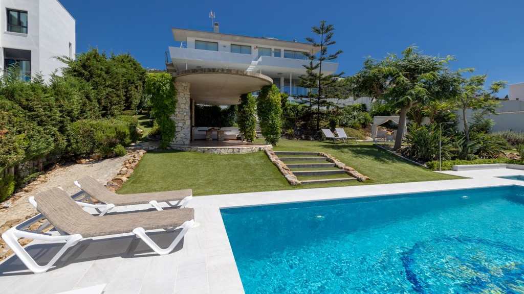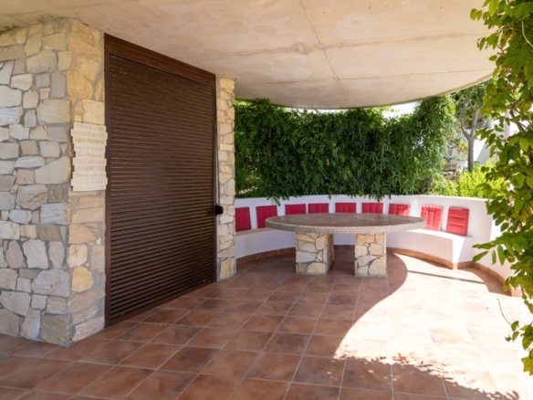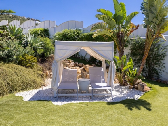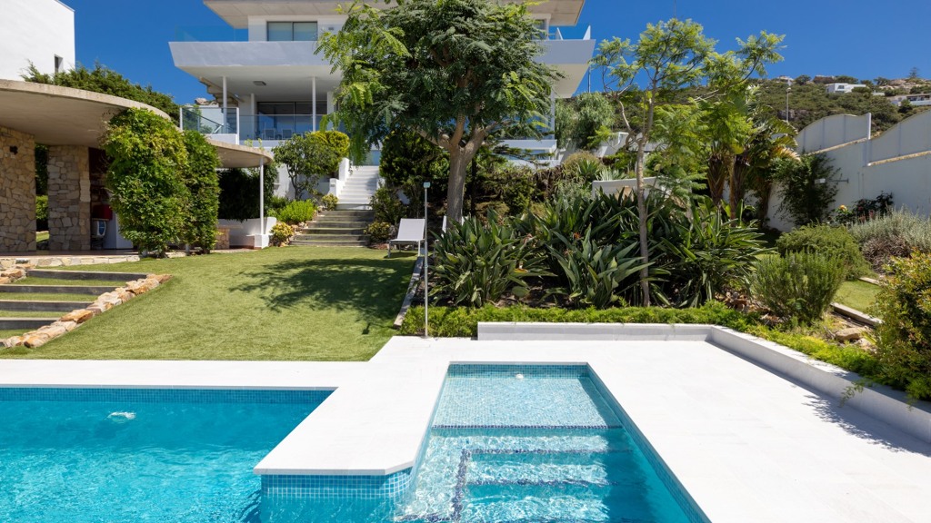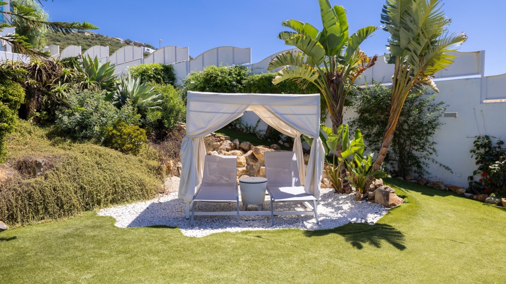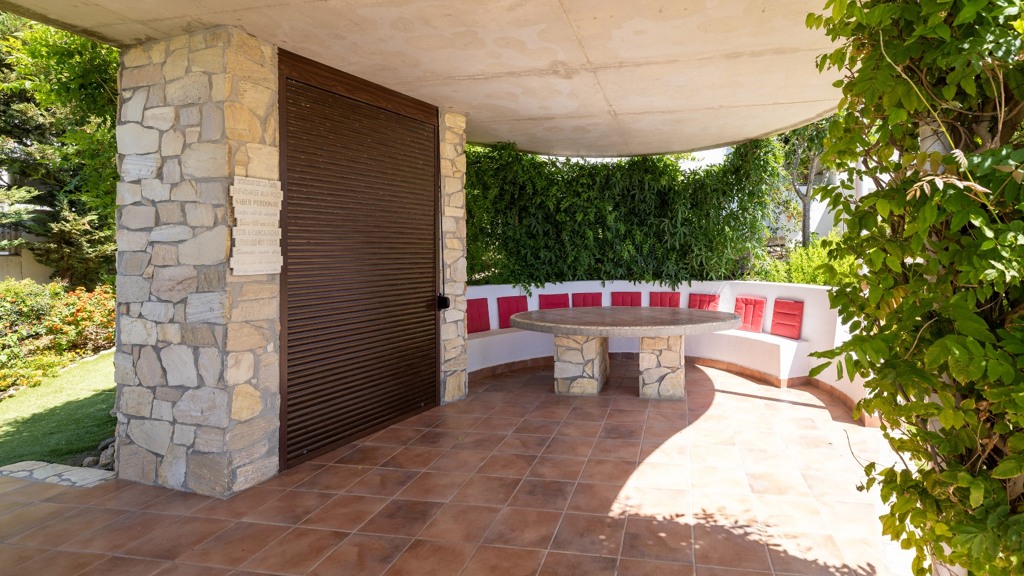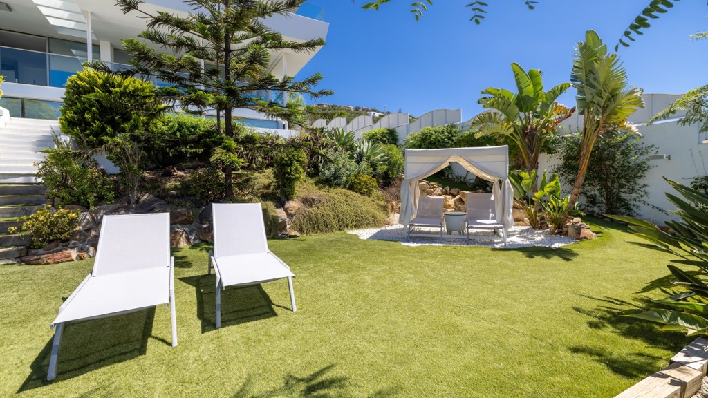 The plot, of more than a thousand square metres, is designed to enjoy different atmospheres and for easy and comfortable maintenance. To this end, it has been fitted with artificial lawn, drip irrigation for the ornamental plants and a saltwater swimming pool, which guarantees the quality and durability of the water. The main areas of the plot are composed of a chillout area, a covered summer dining room with sink, fridge and table and seats, a barbecue area and finally the bathing area, with swimming pool and sun loungers for sunbathing.