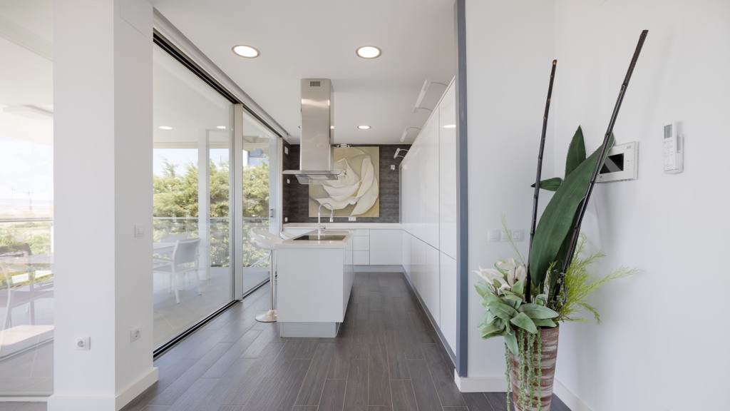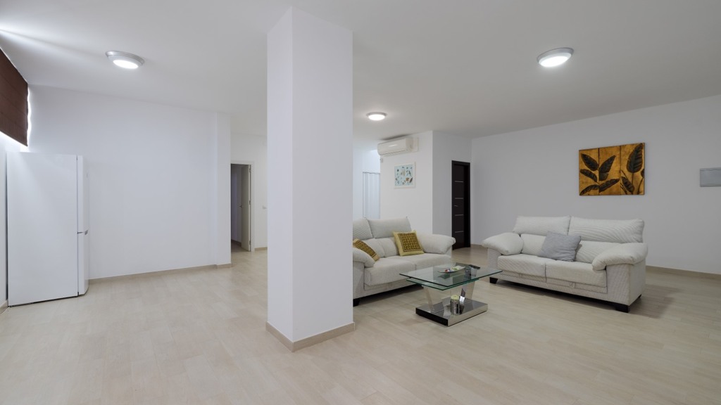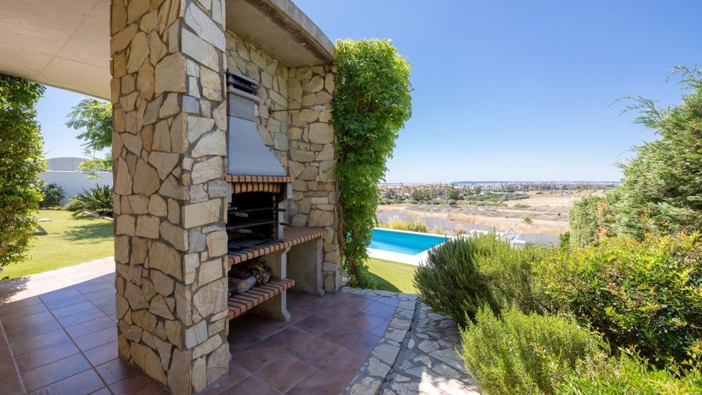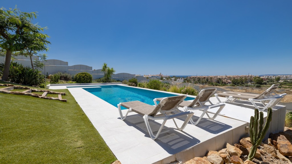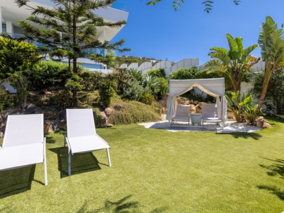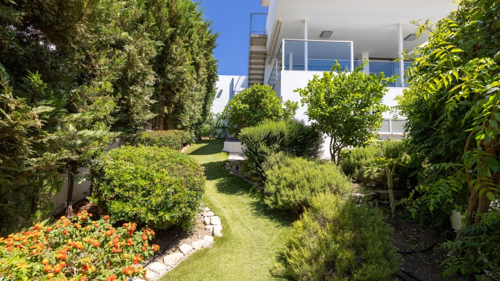 The plot, of more than a thousand square metres, is designed to enjoy different atmospheres and for easy and comfortable maintenance. To this end, it has been fitted with artificial lawn, drip irrigation for the ornamental plants and a saltwater swimming pool, which guarantees the quality and durability of the water. The main areas of the plot are composed of a chillout area, a covered summer dining room with sink, fridge and table and seats, a barbecue area and finally the bathing area, with swimming pool and sun loungers for sunbathing.